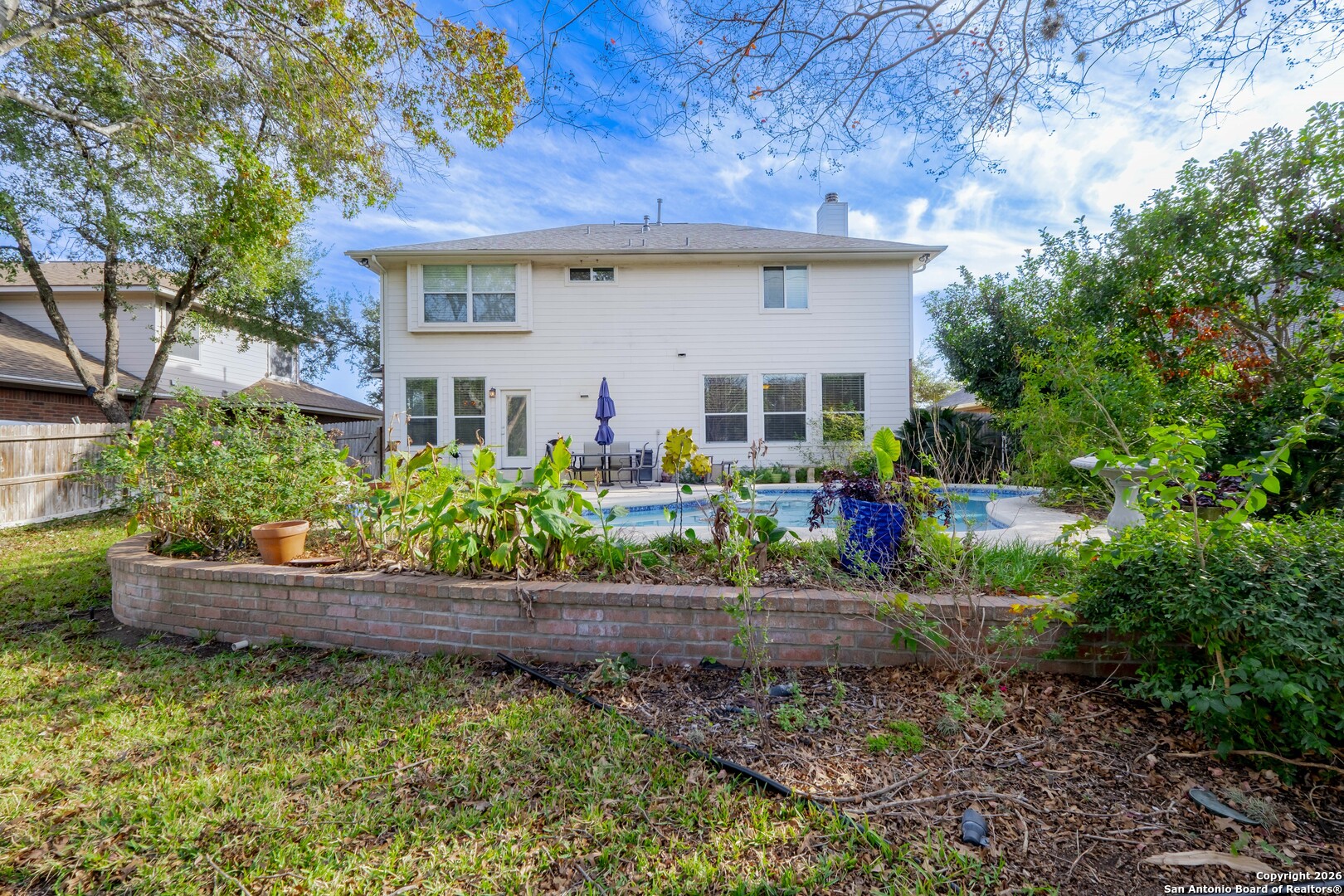 This beautifully designed two-story Ryland Home offers 4 bedrooms, 2.5 bathrooms, and approximately 3,085 square feet of well-planned living space. Located on a quiet dead-end street within a gated community, the home balances open living, privacy, and flexibility for modern lifestyles. The main level welcomes you with a foyer accented by interior archways and hardwood flooring, some of which have had recent repairs. A dedicated office sits just off the entry and is ideal for remote work or a quiet study. The formal dining room connects seamlessly to the spacious living room, which features a fireplace and creates an inviting setting for entertaining. The kitchen is positioned at the heart of the home and offers granite countertops, ample cabinetry, a kitchen island, and a breakfast nook filled with natural light. New kitchen appliances include a microwave, dishwasher, and garbage disposal. The kitchen overlooks the living area, allowing for easy connection with family and guests. A conveniently located half bath, access to the laundry room, and entry to the attached two-car garage complete the first floor. Upstairs, all bedrooms are thoughtfully arranged for privacy. A large game room provides a secondary living or media space overlooking the entry below. The primary suite serves as a true retreat with an oversized walk-in closet and a spacious ensuite bathroom featuring a dual vanity, soaking tub, and a separate walk-in shower. Three additional bedrooms are located on the opposite side of the floor, each with ample closet space and access to nearby bathrooms. New carpet has been installed throughout the upper level. Step outside to a private backyard retreat designed for both relaxation and entertaining. An expansive stone paver patio provides an inviting setting for gatherings, outdoor dining, or weekend lounging, all framed by mature trees that offer shade, privacy, and natural beauty. At the center of the backyard is a sparkling in-ground pool built by Gary Pools, with a depth of approximately 5.5 feet. The surrounding concrete patio allows ample room for poolside dining, lounging, and entertaining. Lush landscaping and layered garden beds enhance the space, creating a peaceful, resort-style atmosphere that feels like an extension of the homes living areas. Additional highlights include a new roof installed in 2025, original AC systems, hardwood flooring throughout the downstairs, a nicely landscaped yard, and an attached two-car garage. With multiple indoor and outdoor living spaces, a dedicated office, all bedrooms upstairs, and a well-separated primary suite, this home is well-suited for growing households or anyone seeking comfort, functionality, and privacy within a gated community.