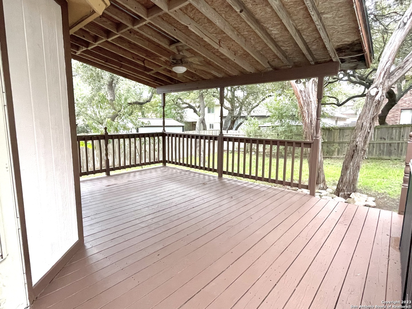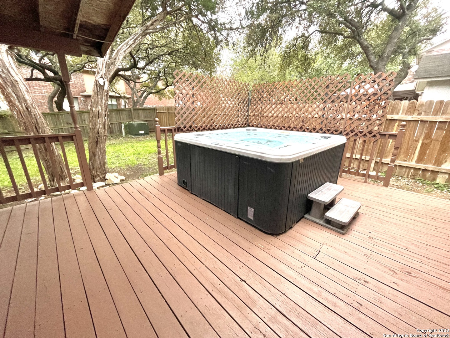 Welcome to this charming and well-maintained four-sided brick exterior home located in the heart of NW San Antonio. This lovely home shows pride of home ownership. Freshly painted through-out and Ready for quick Move-in! Two story home comprised of four bedrooms with two and a half baths. A massive island stands out in the kitchen along with breakfast sit-in area. Ceramic tile on 1st floor, wood stair treads, tile & carpet upstairs. Installed water softener, storm doors, ceiling fans and 2 in faux wood blinds. The master bathroom comes with popular separate his and her vanities, along with separate walk-in closets! Make your way outside onto the spacious covered deck that opens to a backyard with plenty of room to entertain including a hot tub. Seller is offering $2,000 carpet allowance. Be the first to view before it goes. Schedule your private showing today.