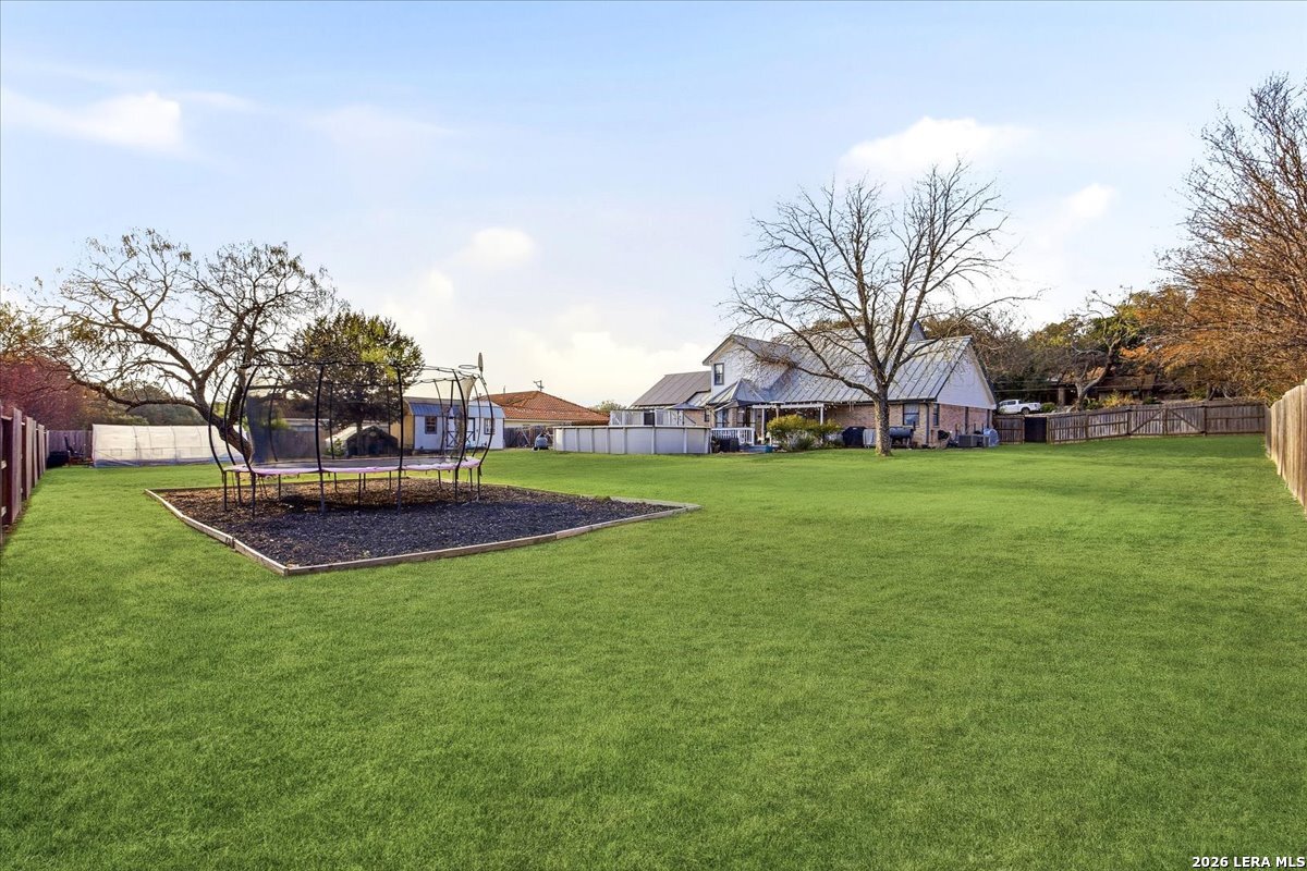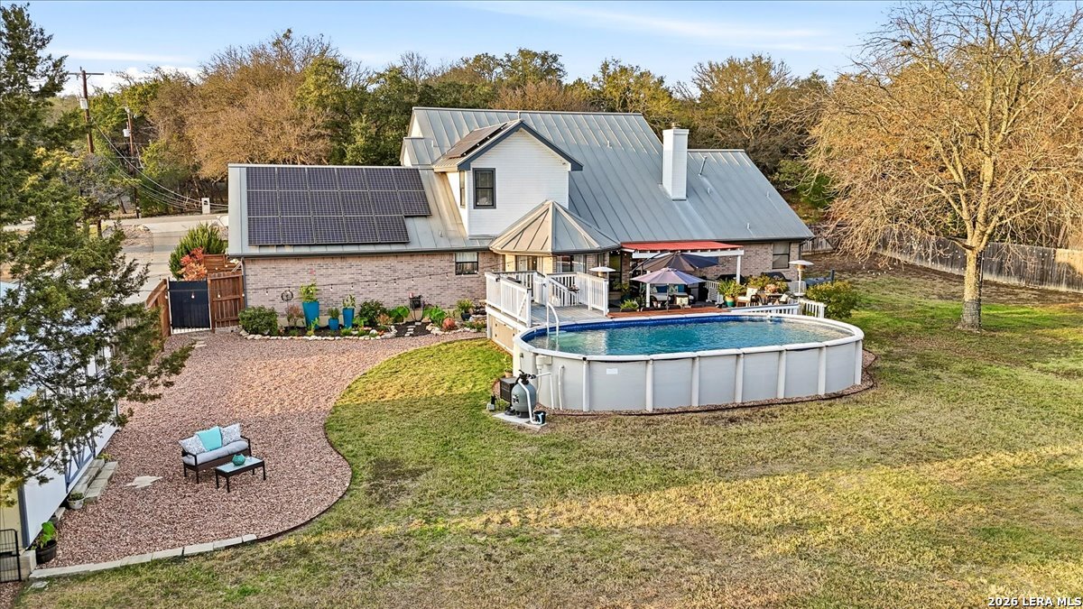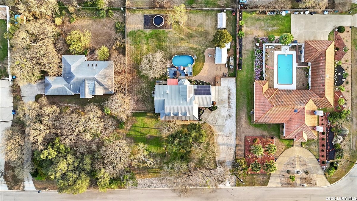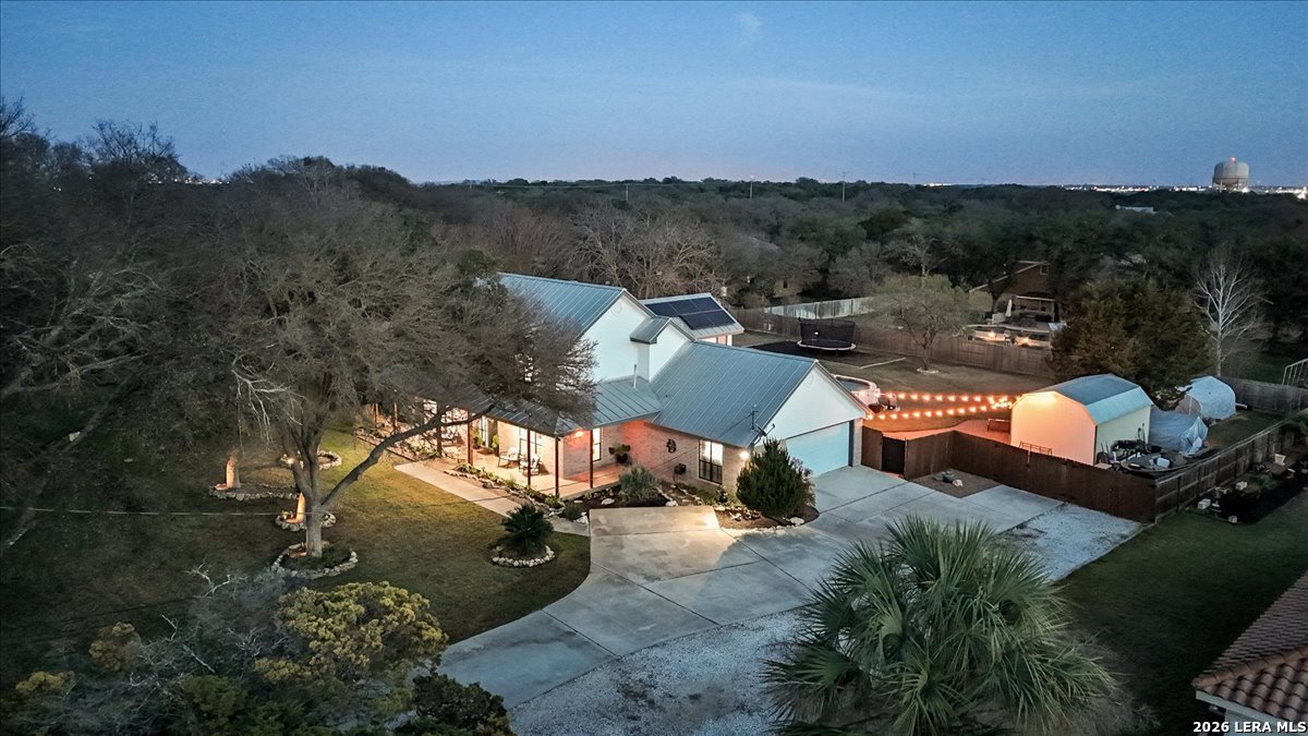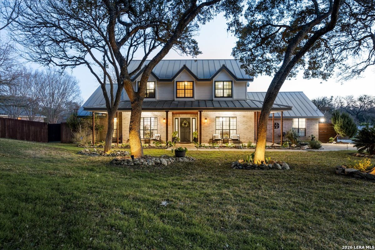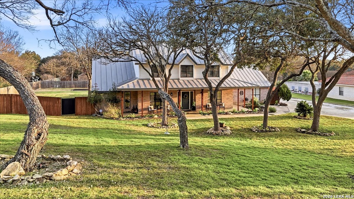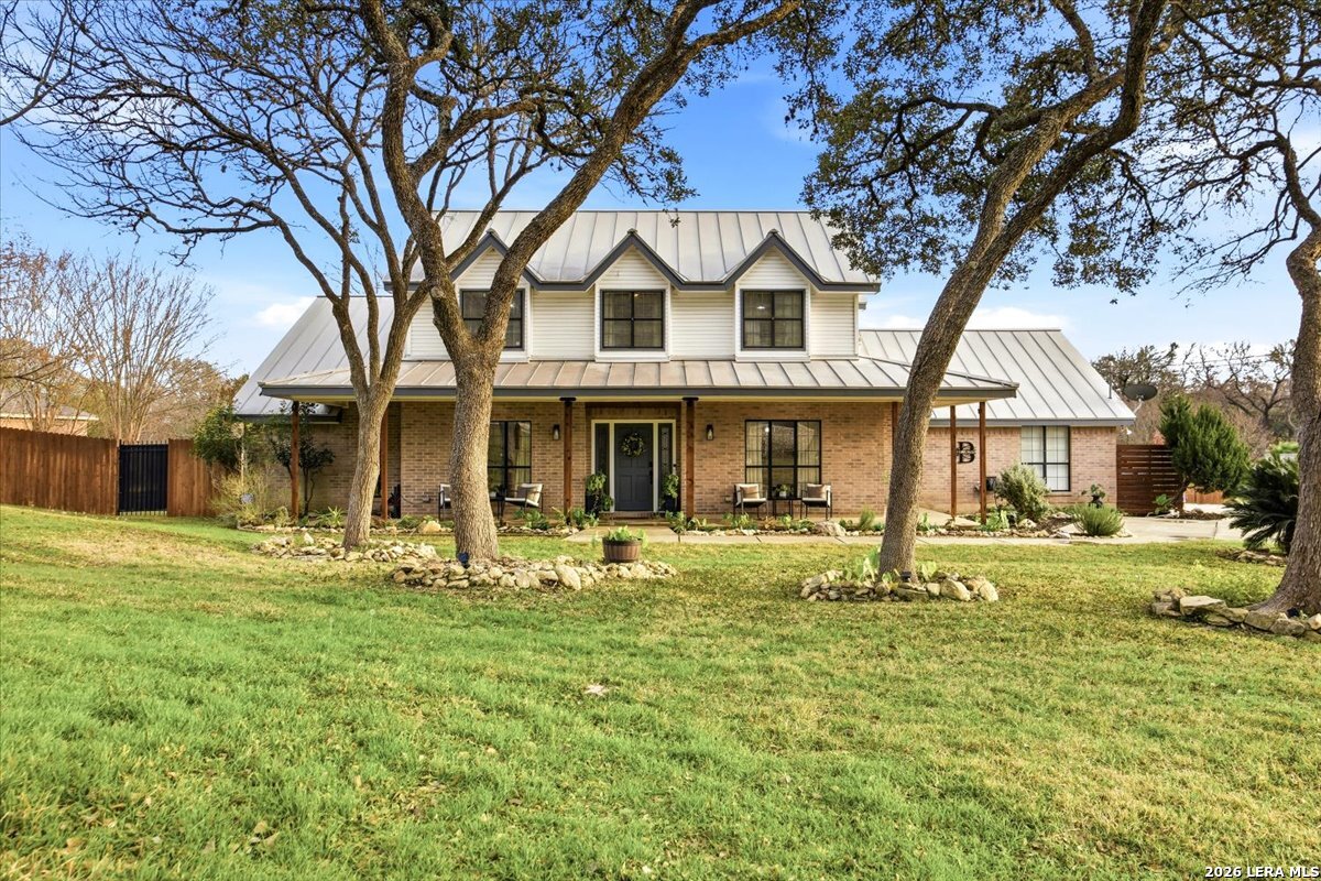 Set on a peaceful three-quarter acre in Garden Ridge Estates, this modern farmhouse at 9608 Azalea Circle captures the best of relaxed country living with everyday convenience close at hand. A welcoming wraparound front porch sets the tone, while inside you'll find four bedrooms, three and a half baths, a private study, and a versatile game room currently with a billiard table but easily serving as a formal dining space. The living room anchors the home with a floor-to-ceiling brick fireplace, built-in entertainment center, and a cozy corner seating nook. A bright kitchen is equipped with white cabinetry, a center island, built-in oven and microwave, and a window over the sink that looks out to the backyard. The primary suite offers hardwood floors and a tray ceiling, paired with a spa-like bath featuring a separate shower, garden tub, and dual vanities with vessel sinks. Upstairs, three spacious bedrooms, two baths, and a charming reading nook create room to spread out. The downstairs laundry room adds function with white cabinetry, an under-mount utility sink, and drying rod. Outdoors is where this property truly shines: an expansive covered patio for entertaining, a separate stone paver patio for grilling and smoking, a pool with poolside bar for easy meals and summer evenings, plus a privacy fence, greenhouse, chicken coop, and a workshop with its own A/C and heat window unit. A long driveway with extended gravel parking, metal roof, and paid-off solar panels round out this thoughtfully designed property, all in an excellent location near Loop 1604, I-35, shopping, and the open beauty of the Texas Hill Country.