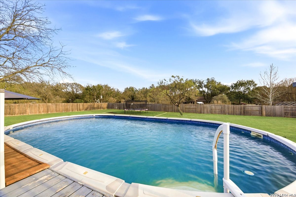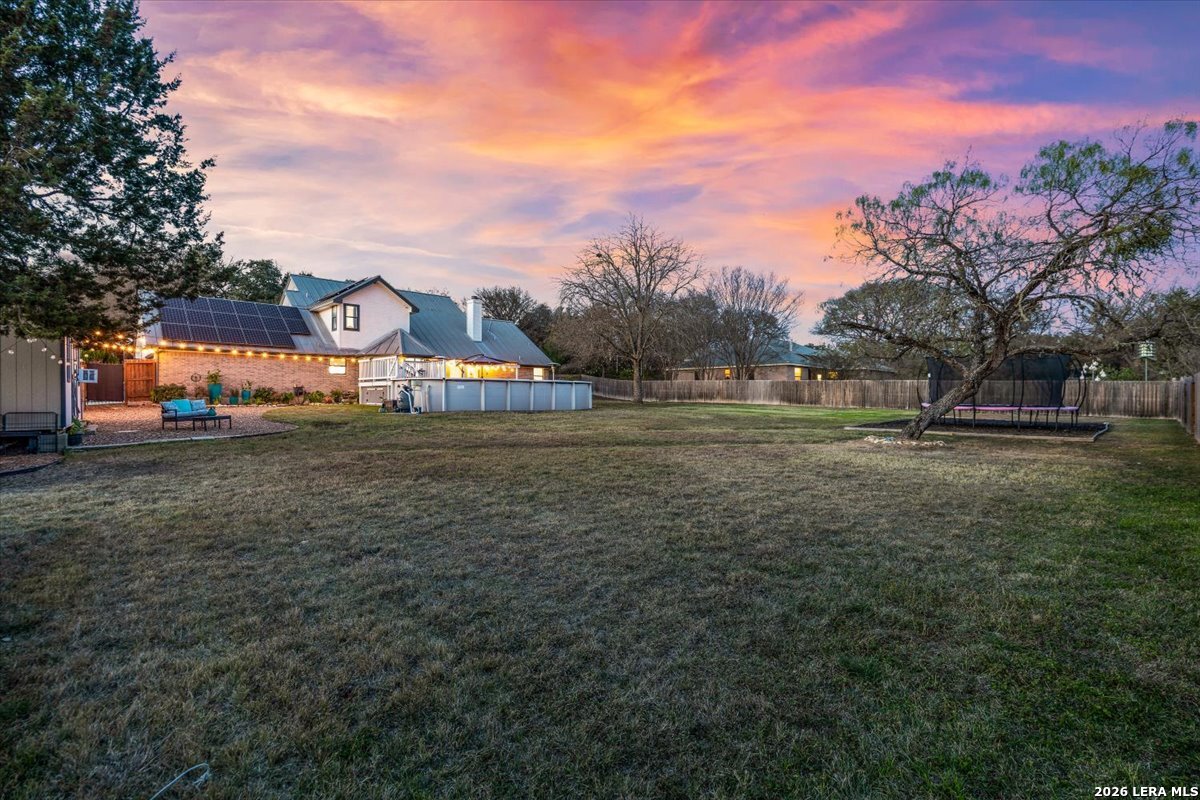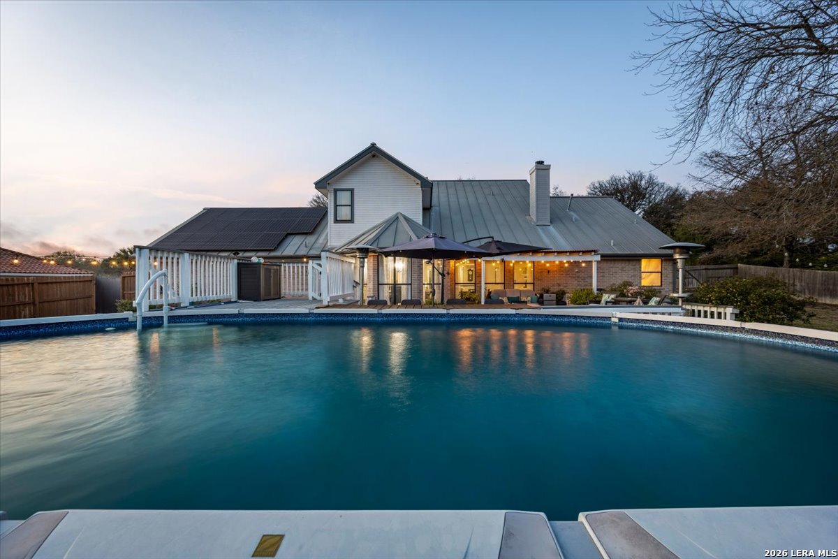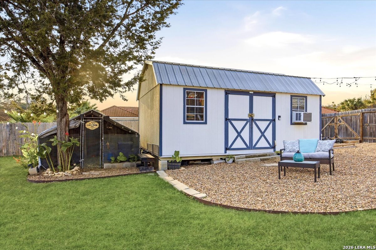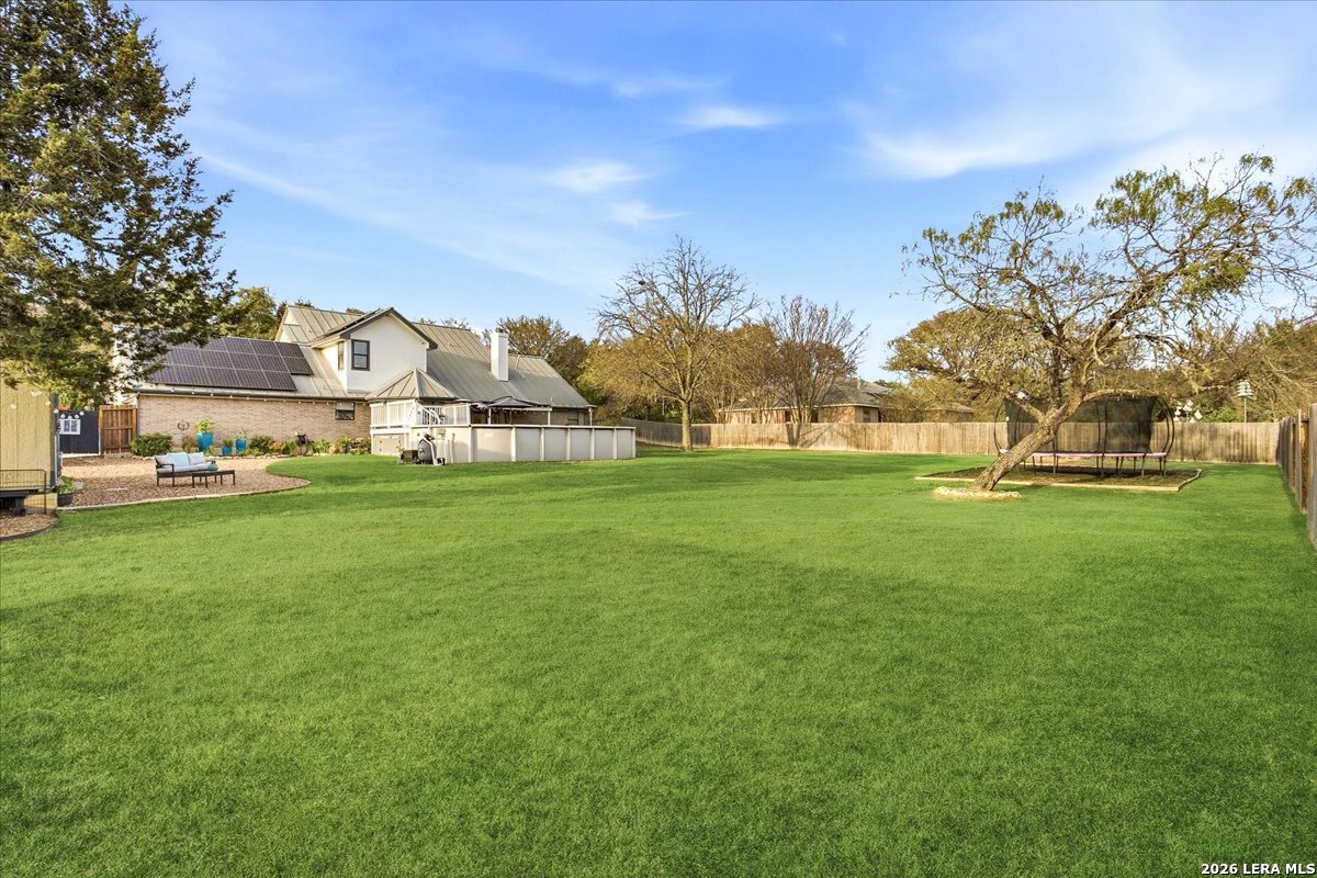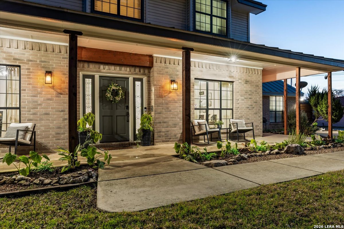 Set on a peaceful three-quarter acre in Garden Ridge Estates, this modern farmhouse at 9608 Azalea Circle captures the best of relaxed country living with everyday convenience close at hand. A welcoming wraparound front porch sets the tone, while inside you'll find four bedrooms, three and a half baths, a private study, and a versatile game room currently with a billiard table but easily serving as a formal dining space. The living room anchors the home with a floor-to-ceiling brick fireplace, built-in entertainment center, and a cozy corner seating nook. A bright kitchen is equipped with white cabinetry, a center island, built-in oven and microwave, and a window over the sink that looks out to the backyard. The primary suite offers hardwood floors and a tray ceiling, paired with a spa-like bath featuring a separate shower, garden tub, and dual vanities with vessel sinks. Upstairs, three spacious bedrooms, two baths, and a charming reading nook create room to spread out. The downstairs laundry room adds function with white cabinetry, an under-mount utility sink, and drying rod. Outdoors is where this property truly shines: an expansive covered patio for entertaining, a separate stone paver patio for grilling and smoking, a pool with poolside bar for easy meals and summer evenings, plus a privacy fence, greenhouse, chicken coop, and a workshop with its own A/C and heat window unit. A long driveway with extended gravel parking, metal roof, and paid-off solar panels round out this thoughtfully designed property, all in an excellent location near Loop 1604, I-35, shopping, and the open beauty of the Texas Hill Country.