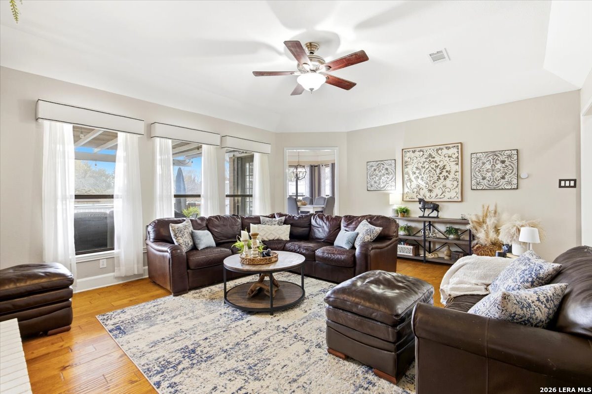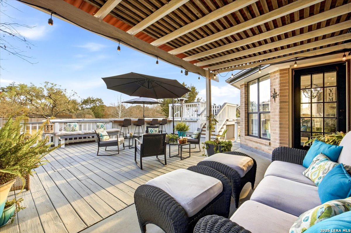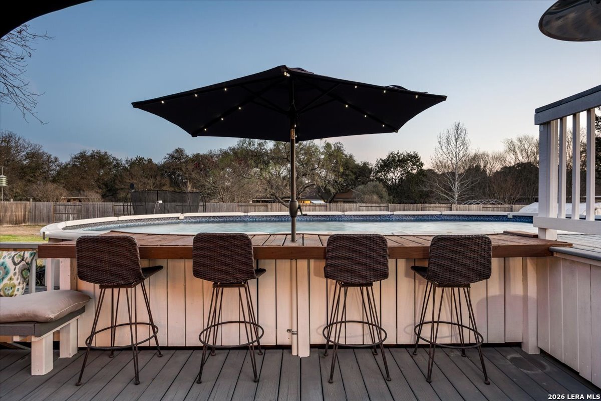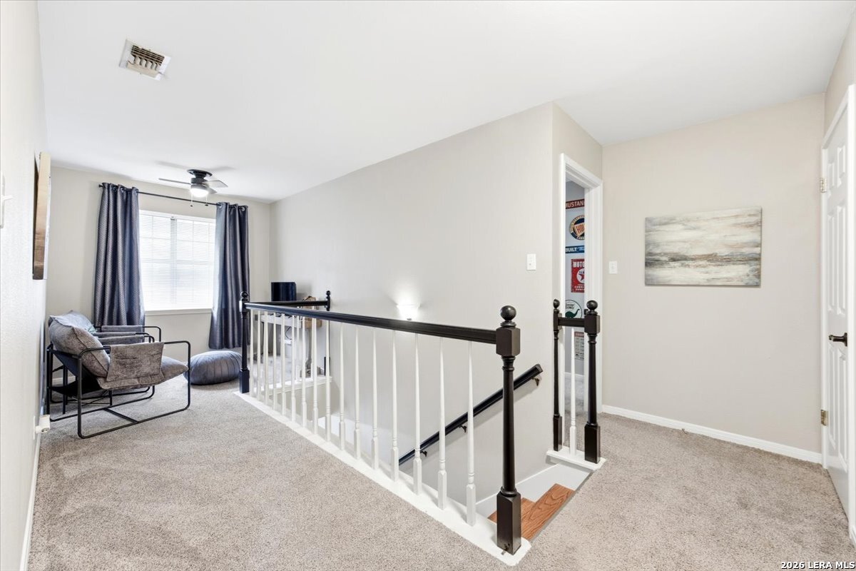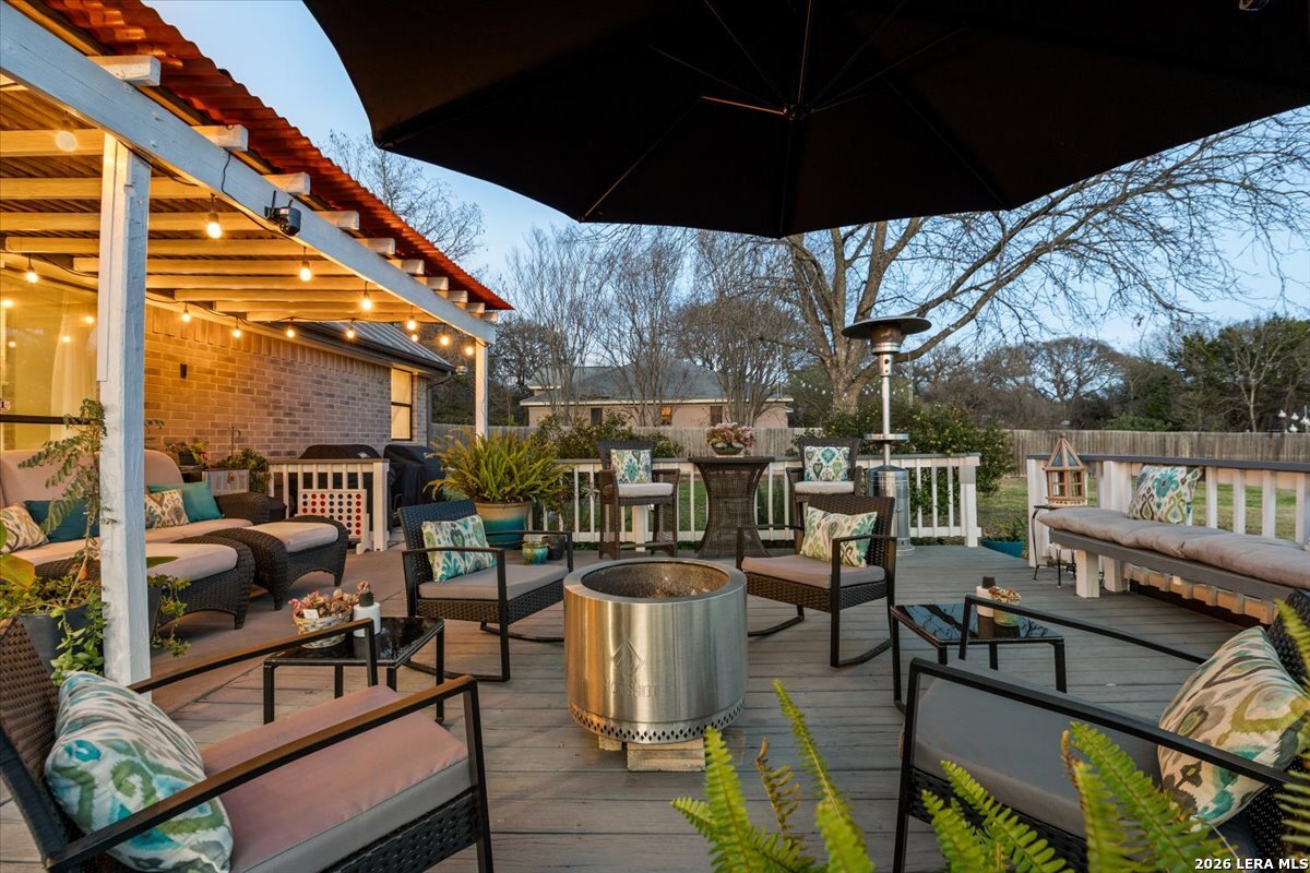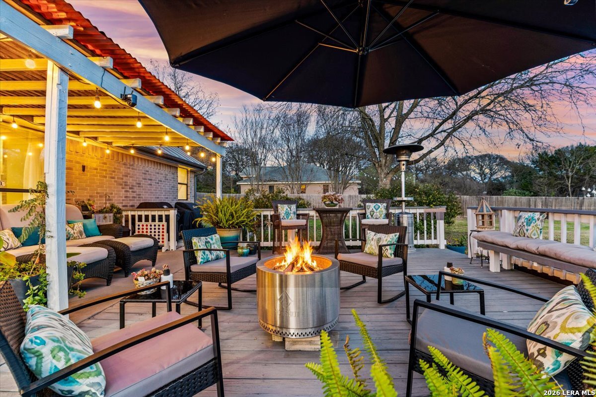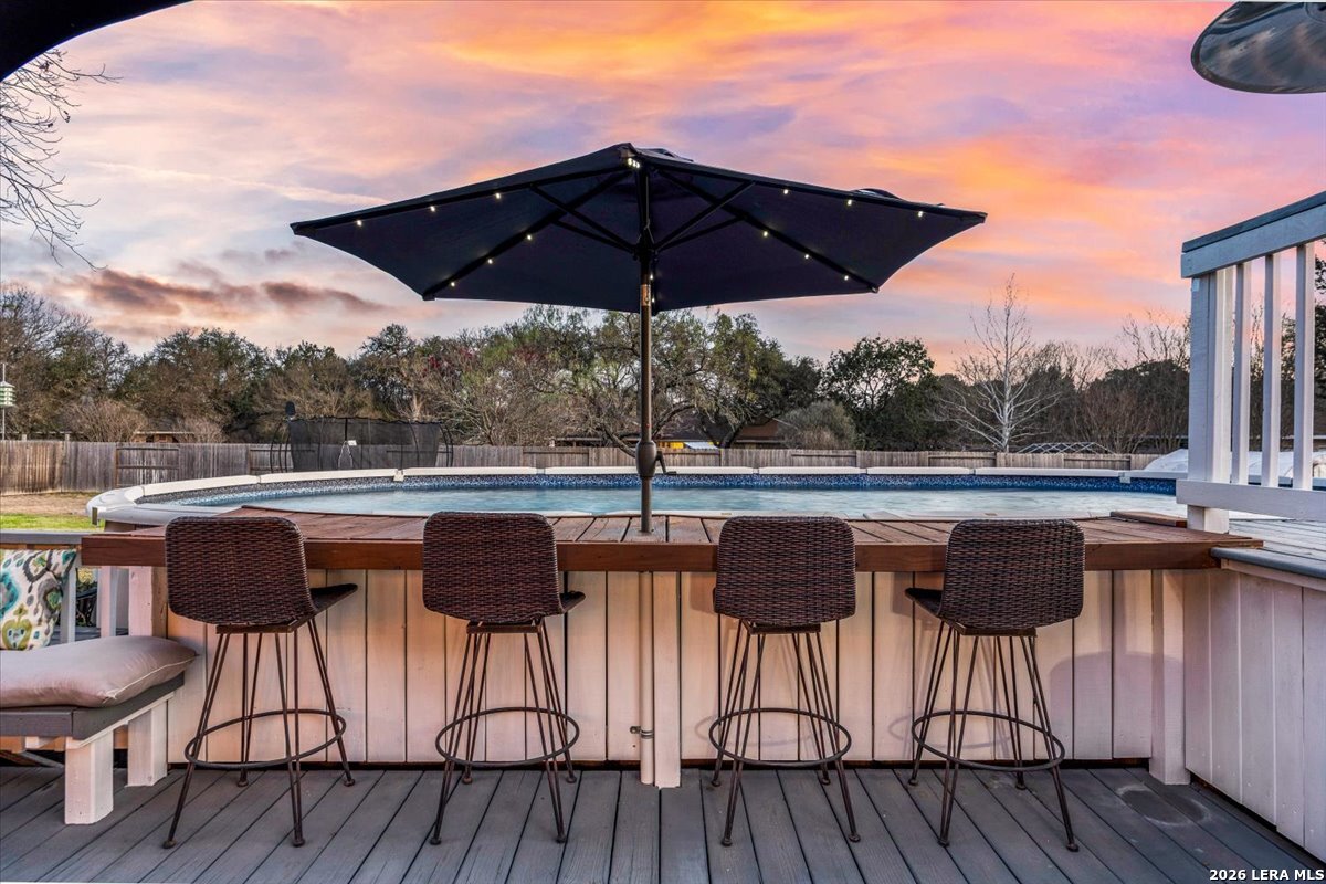 Set on a peaceful three-quarter acre in Garden Ridge Estates, this modern farmhouse at 9608 Azalea Circle captures the best of relaxed country living with everyday convenience close at hand. A welcoming wraparound front porch sets the tone, while inside you'll find four bedrooms, three and a half baths, a private study, and a versatile game room currently with a billiard table but easily serving as a formal dining space. The living room anchors the home with a floor-to-ceiling brick fireplace, built-in entertainment center, and a cozy corner seating nook. A bright kitchen is equipped with white cabinetry, a center island, built-in oven and microwave, and a window over the sink that looks out to the backyard. The primary suite offers hardwood floors and a tray ceiling, paired with a spa-like bath featuring a separate shower, garden tub, and dual vanities with vessel sinks. Upstairs, three spacious bedrooms, two baths, and a charming reading nook create room to spread out. The downstairs laundry room adds function with white cabinetry, an under-mount utility sink, and drying rod. Outdoors is where this property truly shines: an expansive covered patio for entertaining, a separate stone paver patio for grilling and smoking, a pool with poolside bar for easy meals and summer evenings, plus a privacy fence, greenhouse, chicken coop, and a workshop with its own A/C and heat window unit. A long driveway with extended gravel parking, metal roof, and paid-off solar panels round out this thoughtfully designed property, all in an excellent location near Loop 1604, I-35, shopping, and the open beauty of the Texas Hill Country.