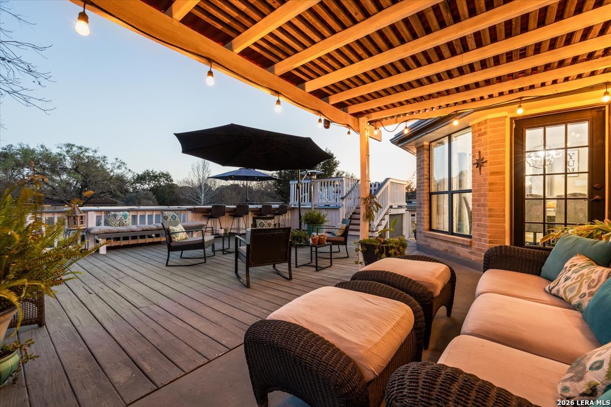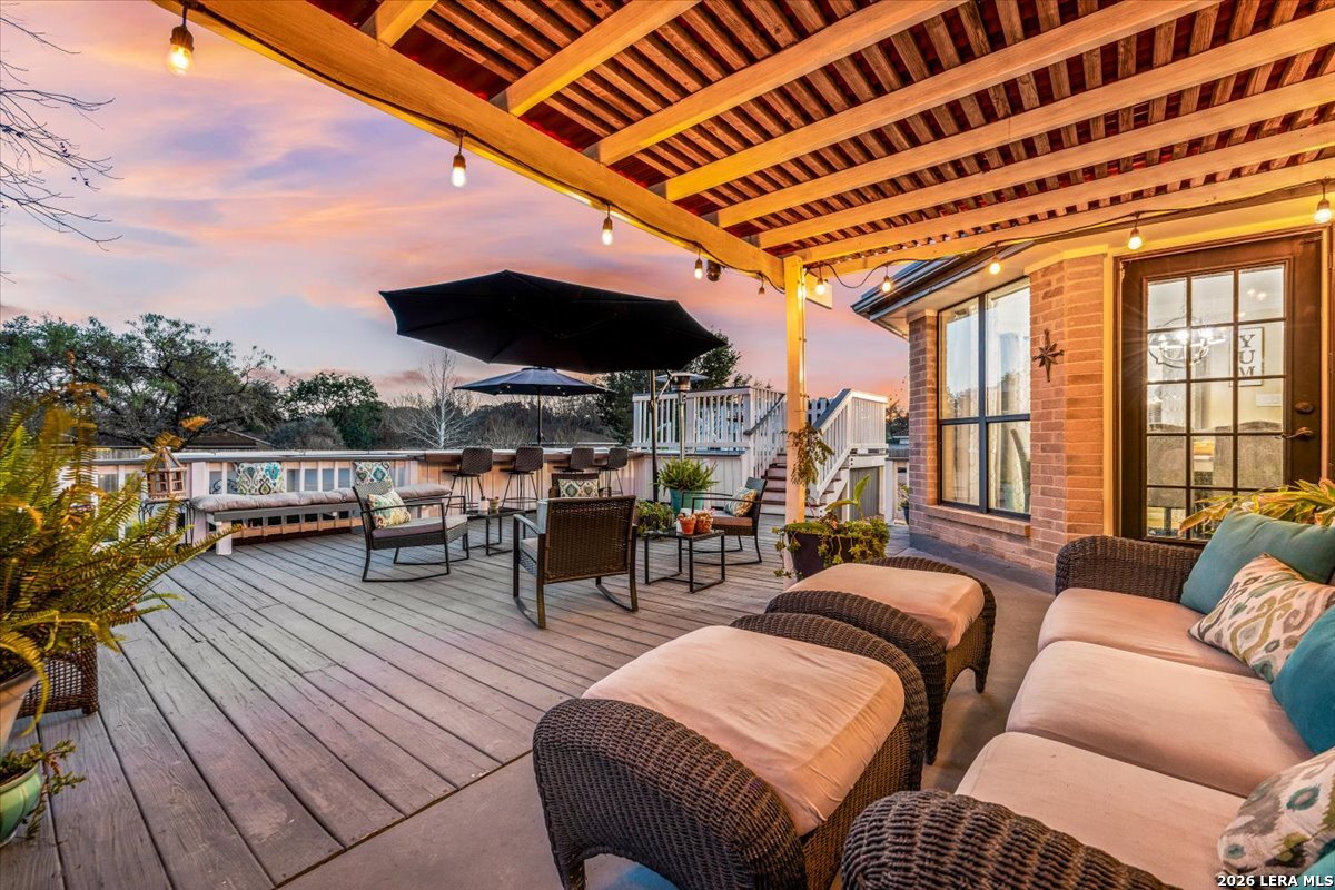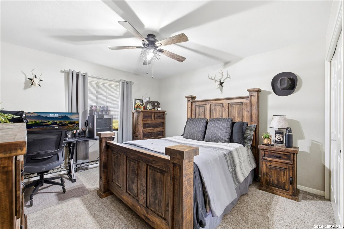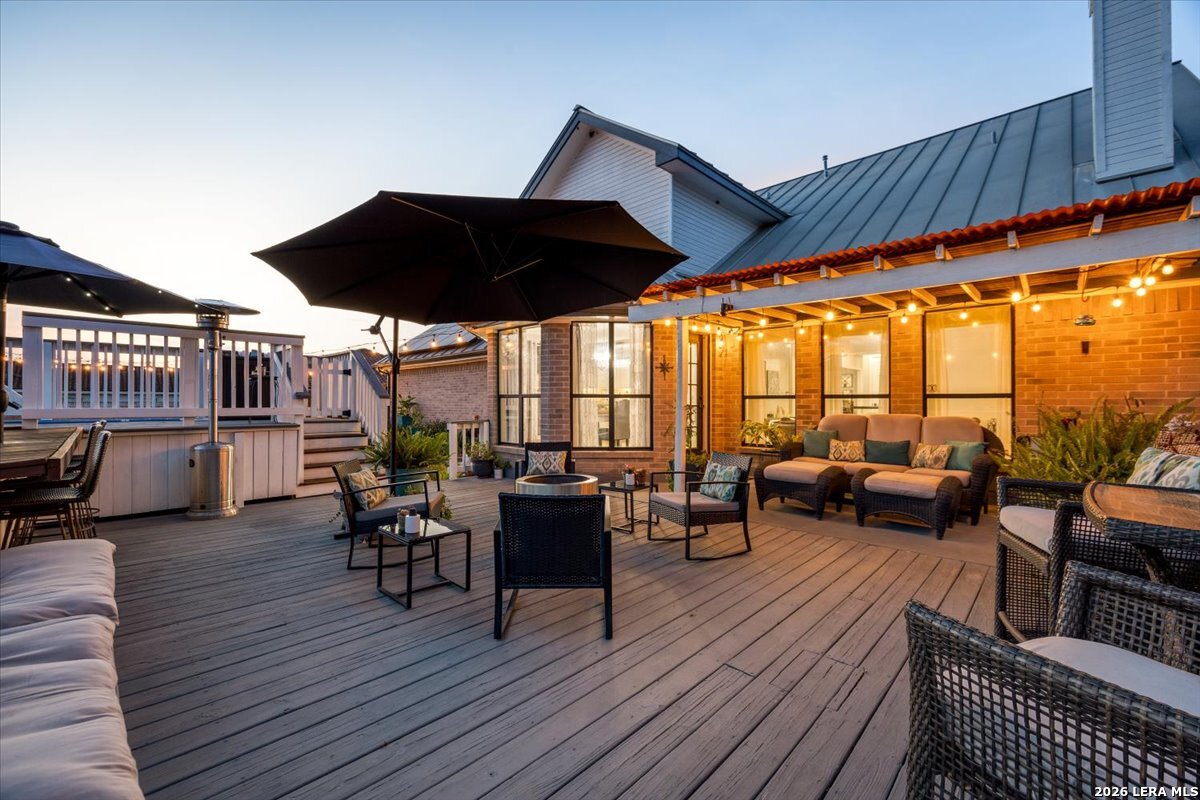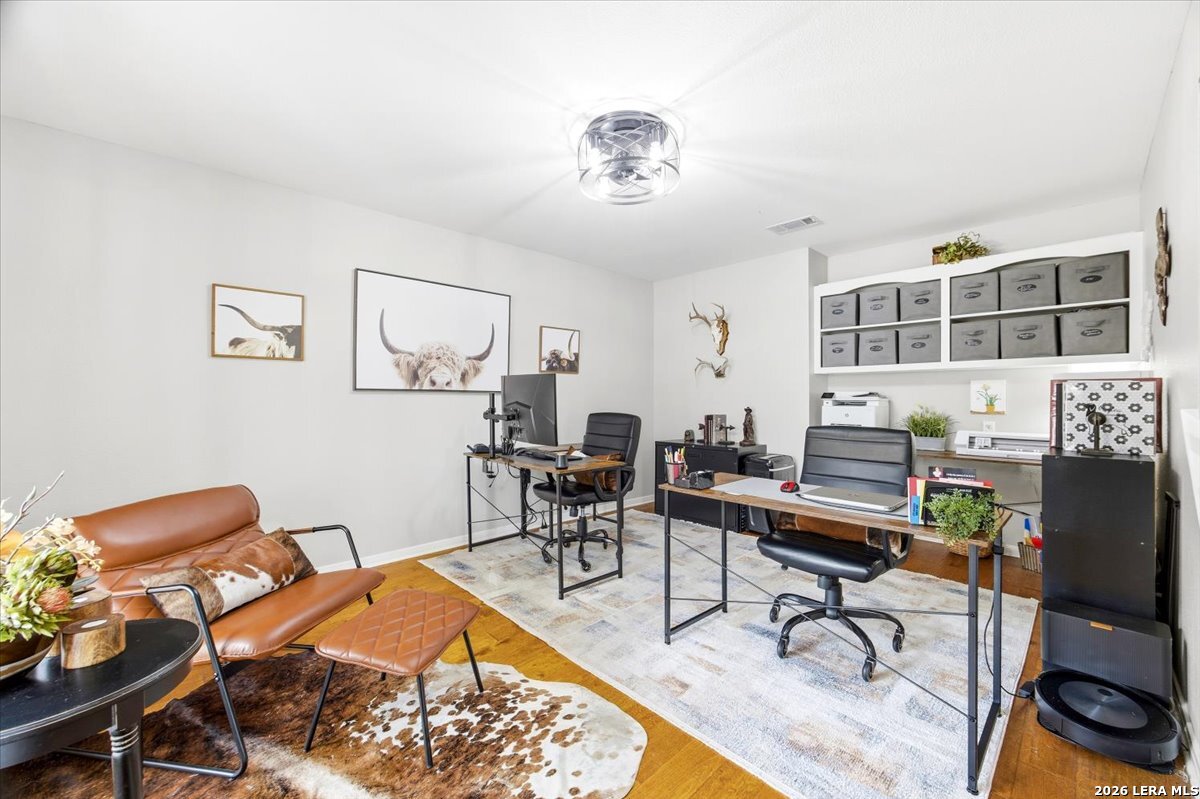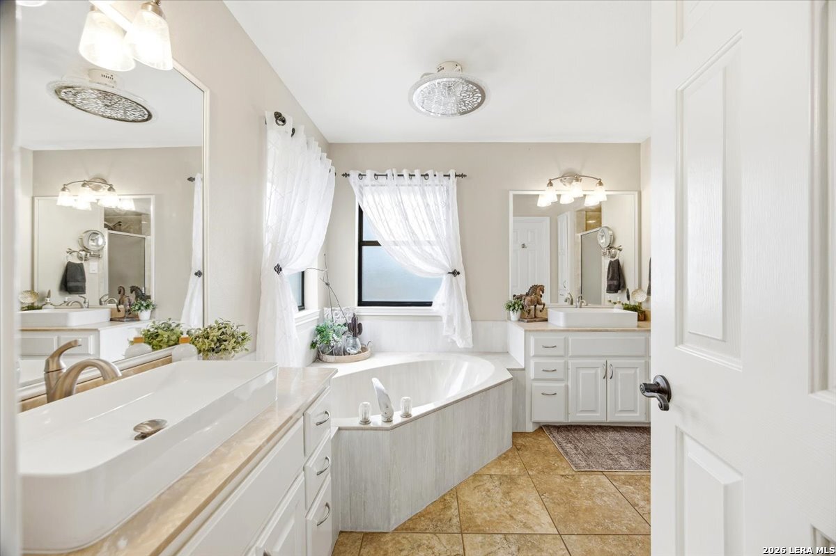 Set on a peaceful three-quarter acre in Garden Ridge Estates, this modern farmhouse at 9608 Azalea Circle captures the best of relaxed country living with everyday convenience close at hand. A welcoming wraparound front porch sets the tone, while inside you'll find four bedrooms, three and a half baths, a private study, and a versatile game room currently with a billiard table but easily serving as a formal dining space. The living room anchors the home with a floor-to-ceiling brick fireplace, built-in entertainment center, and a cozy corner seating nook. A bright kitchen is equipped with white cabinetry, a center island, built-in oven and microwave, and a window over the sink that looks out to the backyard. The primary suite offers hardwood floors and a tray ceiling, paired with a spa-like bath featuring a separate shower, garden tub, and dual vanities with vessel sinks. Upstairs, three spacious bedrooms, two baths, and a charming reading nook create room to spread out. The downstairs laundry room adds function with white cabinetry, an under-mount utility sink, and drying rod. Outdoors is where this property truly shines: an expansive covered patio for entertaining, a separate stone paver patio for grilling and smoking, a pool with poolside bar for easy meals and summer evenings, plus a privacy fence, greenhouse, chicken coop, and a workshop with its own A/C and heat window unit. A long driveway with extended gravel parking, metal roof, and paid-off solar panels round out this thoughtfully designed property, all in an excellent location near Loop 1604, I-35, shopping, and the open beauty of the Texas Hill Country.