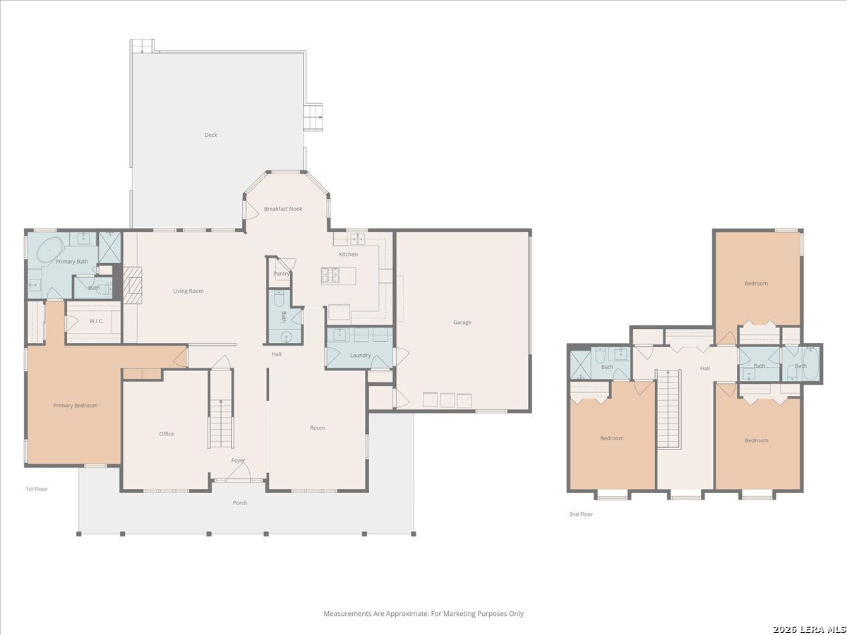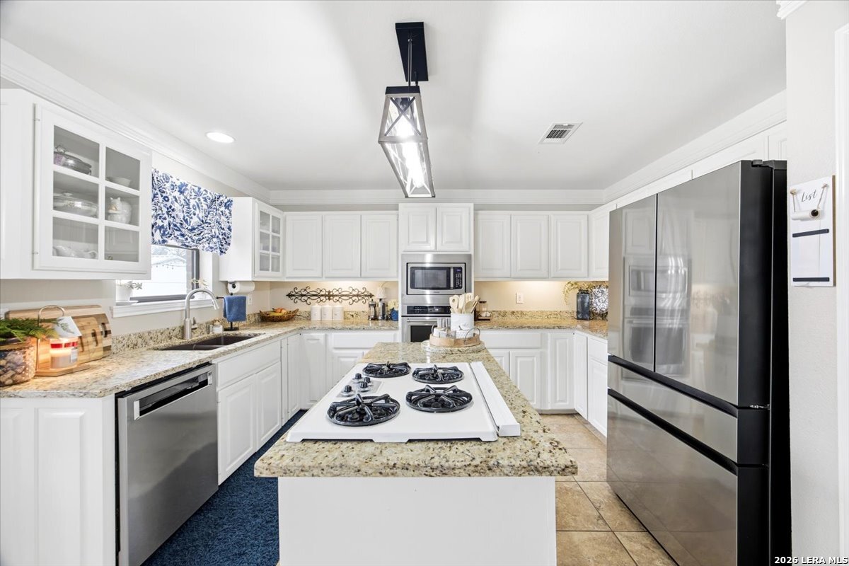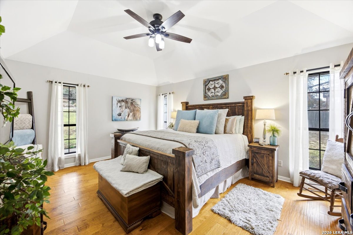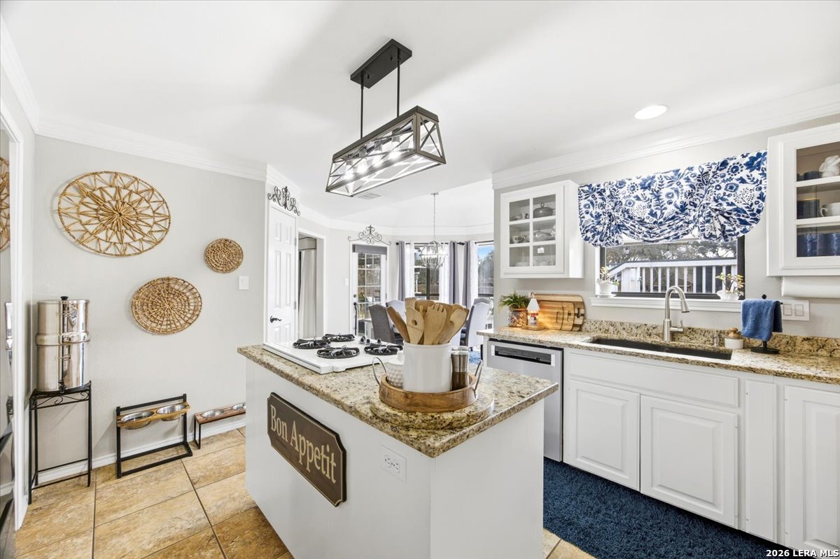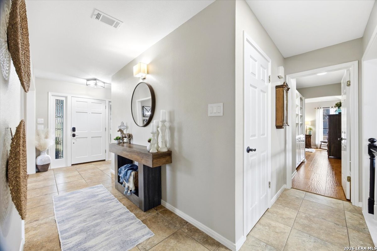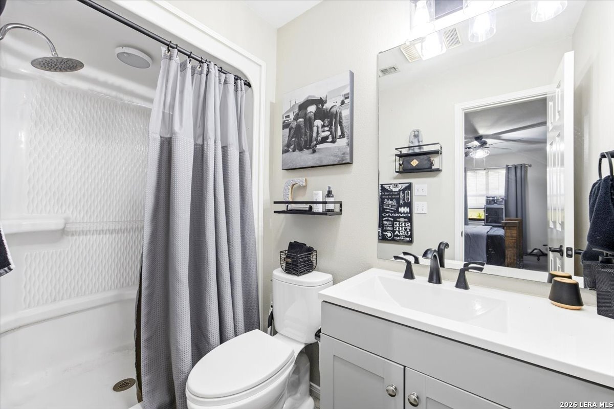 Set on a peaceful three-quarter acre in Garden Ridge Estates, this modern farmhouse at 9608 Azalea Circle captures the best of relaxed country living with everyday convenience close at hand. A welcoming wraparound front porch sets the tone, while inside you'll find four bedrooms, three and a half baths, a private study, and a versatile game room currently with a billiard table but easily serving as a formal dining space. The living room anchors the home with a floor-to-ceiling brick fireplace, built-in entertainment center, and a cozy corner seating nook. A bright kitchen is equipped with white cabinetry, a center island, built-in oven and microwave, and a window over the sink that looks out to the backyard. The primary suite offers hardwood floors and a tray ceiling, paired with a spa-like bath featuring a separate shower, garden tub, and dual vanities with vessel sinks. Upstairs, three spacious bedrooms, two baths, and a charming reading nook create room to spread out. The downstairs laundry room adds function with white cabinetry, an under-mount utility sink, and drying rod. Outdoors is where this property truly shines: an expansive covered patio for entertaining, a separate stone paver patio for grilling and smoking, a pool with poolside bar for easy meals and summer evenings, plus a privacy fence, greenhouse, chicken coop, and a workshop with its own A/C and heat window unit. A long driveway with extended gravel parking, metal roof, and paid-off solar panels round out this thoughtfully designed property, all in an excellent location near Loop 1604, I-35, shopping, and the open beauty of the Texas Hill Country.