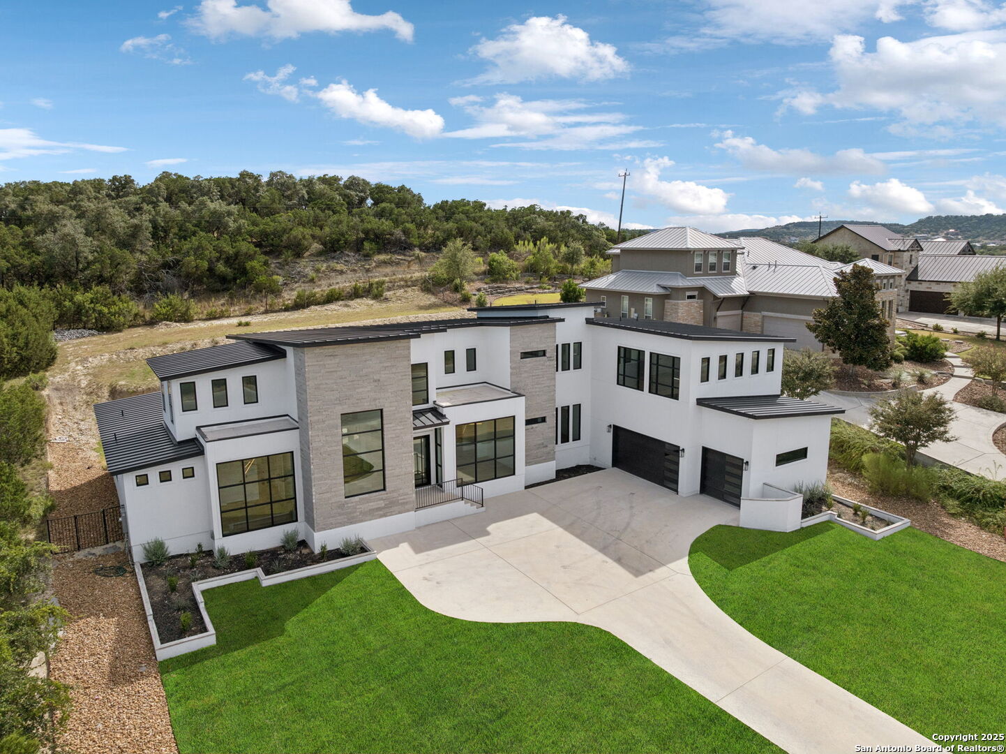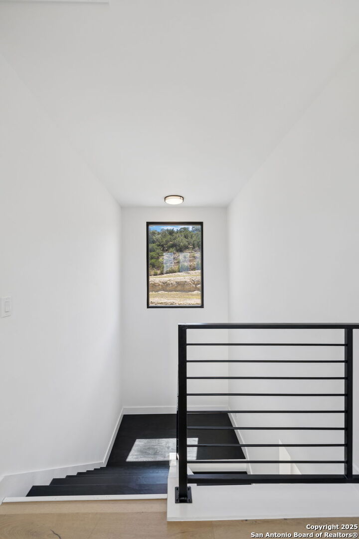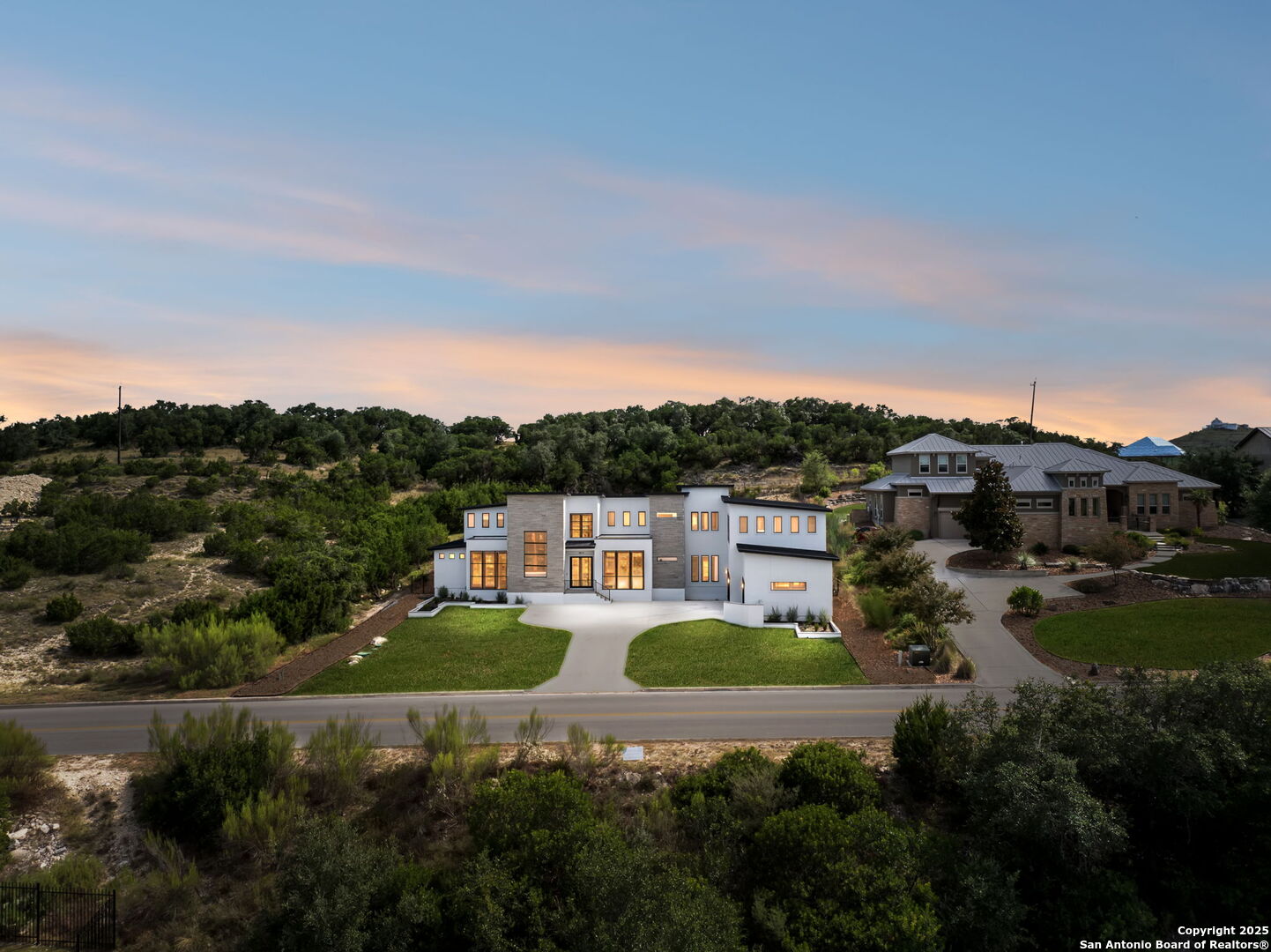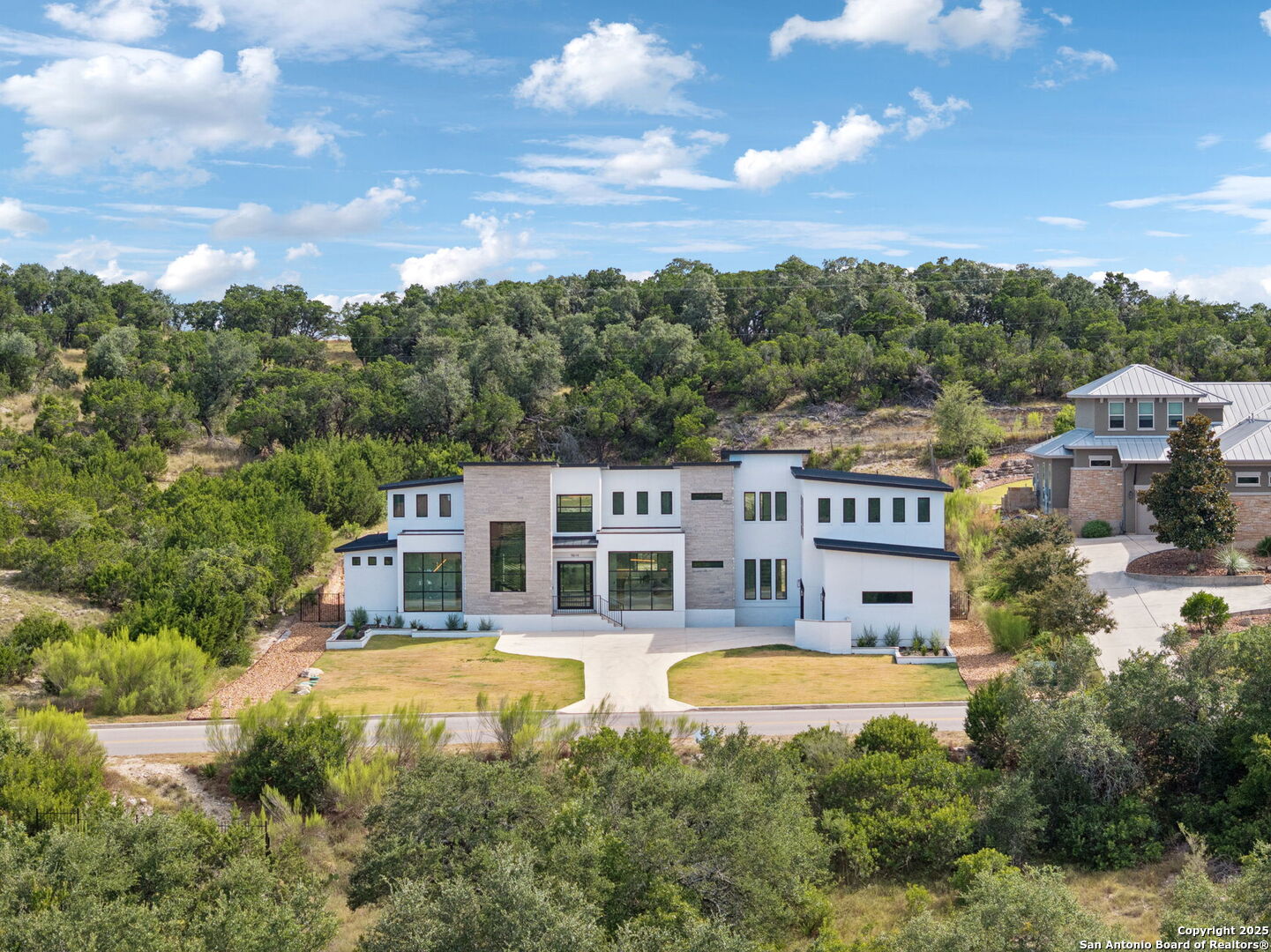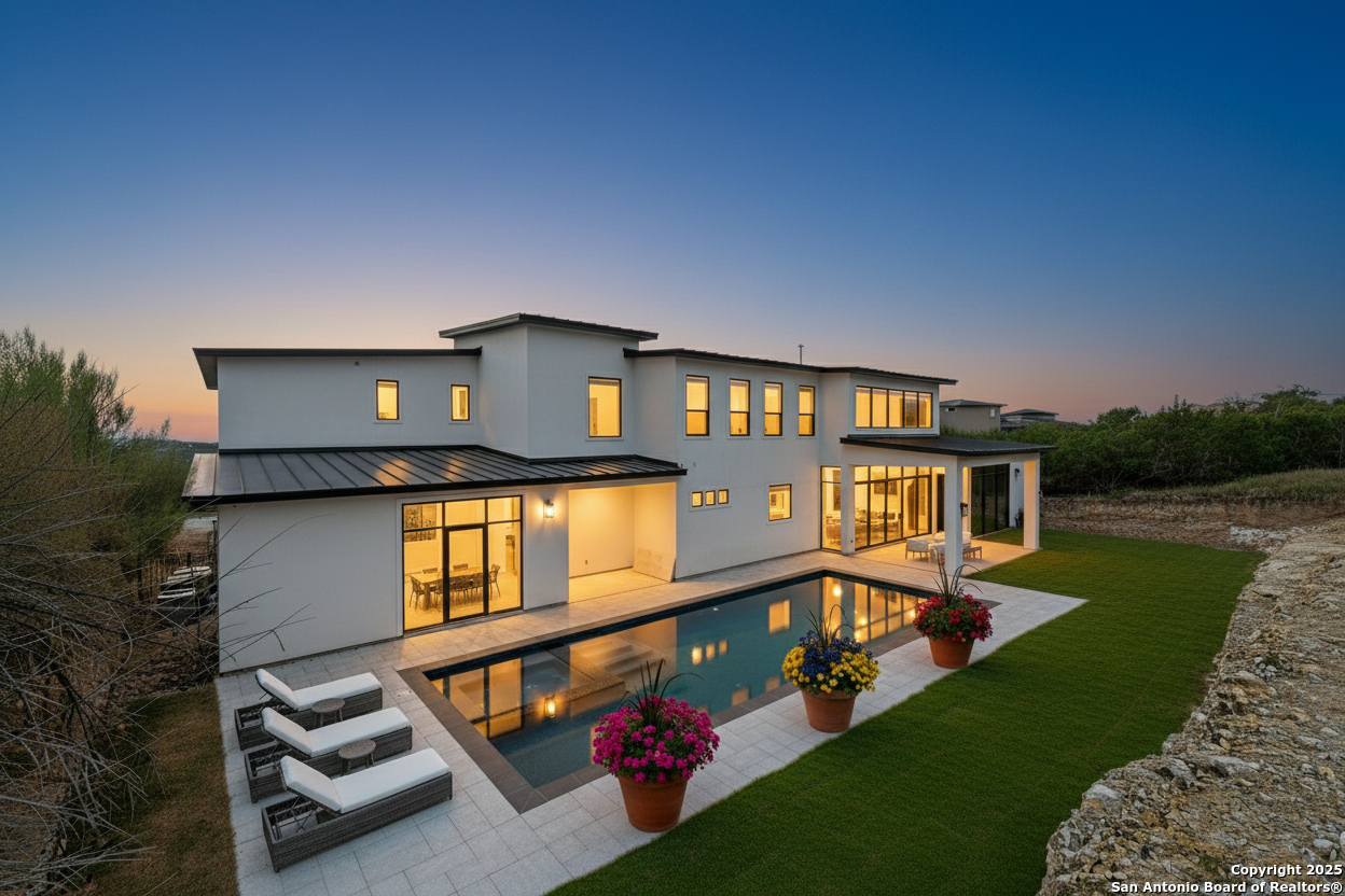 Seller motivated! Where Architectural brilliance meets the edge of the sky. There are homes you see - and homes you remember. Perched high in the prestigious Canyons at Scenic Loop, 9614 Ivory Canyon is unforgettable. It rises from the hillside like a modern sculpture, its crisp white stucco, horizontal limestone, and standing-seam metal roof glowing under the Texas sun by day and shimmering under architectural uplighting by night. From the moment you arrive, the horizon becomes yours - an uninterrupted 180 panorama of Hill Country beauty, visible from nearly every room. Step through the custom pivoting glass front door into a two-story foyer where a floating oak staircase rises beside a dramatic bookmatched marble fireplace. Natural light pours into the great room and dining space, where remote-controlled blinds, high-gloss cabinetry, and wide-plank oak floors showcase the thoughtful balance of elegance and ease. The chef's kitchen is a work of art, outfitted with a full suite of Bosch appliances - including a WiFi-enabled oven - waterfall-edge Calacatta quartz island, and a concealed walk-in pantry doubling as a prep kitchen. The primary suite is a private sanctuary designed to soothe, with floor-to-ceiling windows, boutique-style dual closets, and a spa bath wrapped in marble slabs featuring dual rainfall showers and a freestanding soaking tub. A main-level guest suite with its own living area and ensuite bath provides unmatched privacy for family or long-stay guests. Upstairs, a massive game/theater room with wet bar, storage, invites gatherings both casual and grand. Smart-home wiring throughout - including Control 4 compatibility, iPad wall controllers, and whole-home audio - ensures technology and comfort are always at your fingertips. This is a home where every detail is intentional - from remote blinds and 8-zone audio and zoned HVAC. Just six minutes from daily conveniences and 15 minutes from The Rim, yet wrapped in the quiet grandeur of the Hill Country, this home offers more than luxury - it offers presence. 9614 Ivory Canyon isn't just a home - it's a statement. Modern, bespoke, barely lived in, and built for those who demand elegance without sacrificing comfort. Schedule your private tour today and experience the harmony of design, technology, and livability this home uniquely delivers.