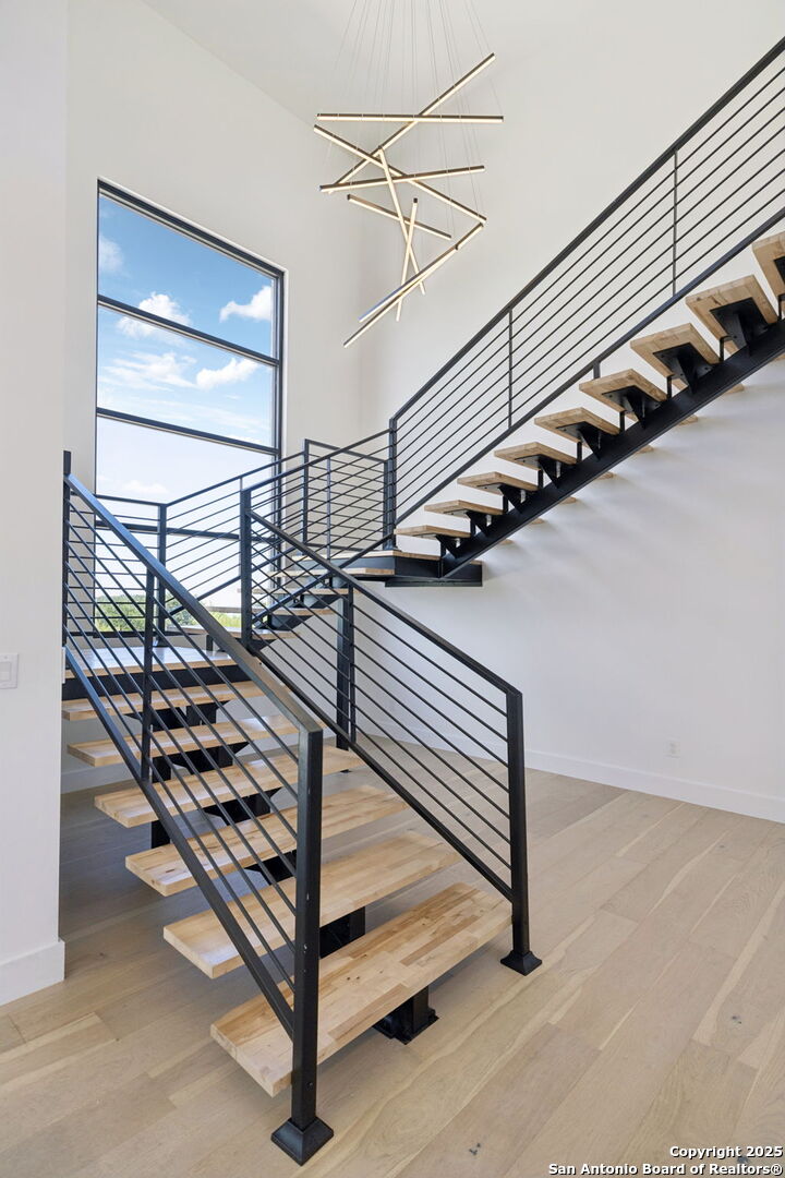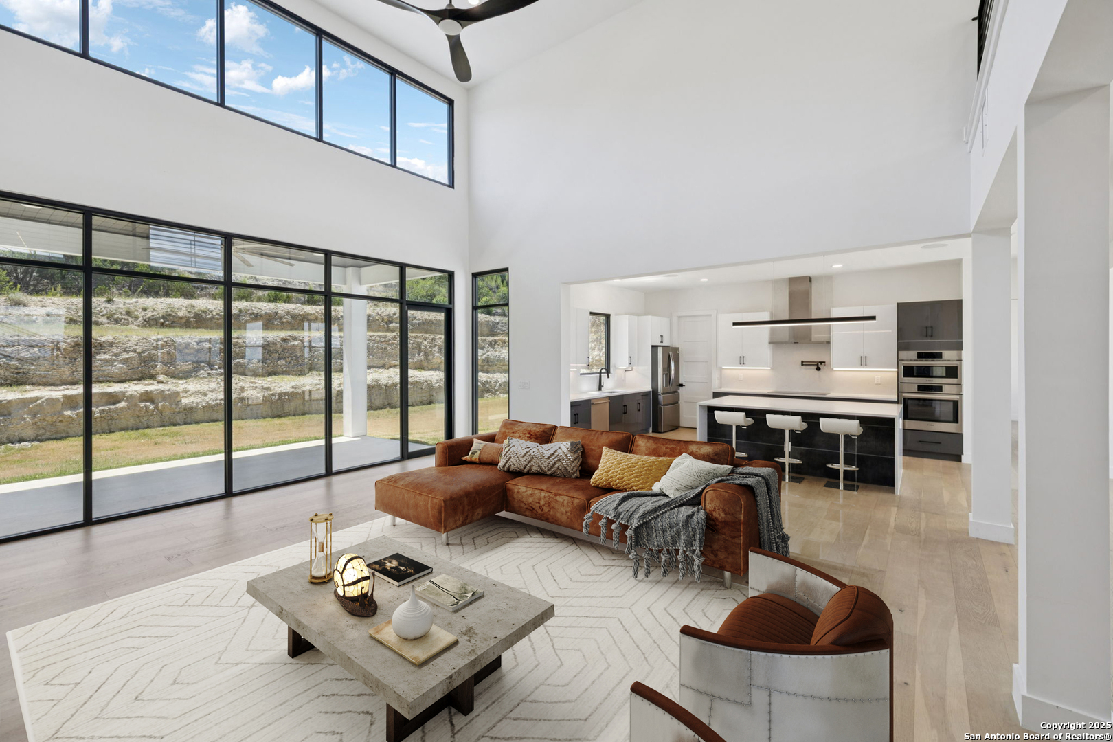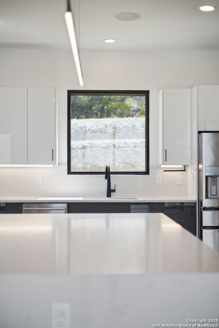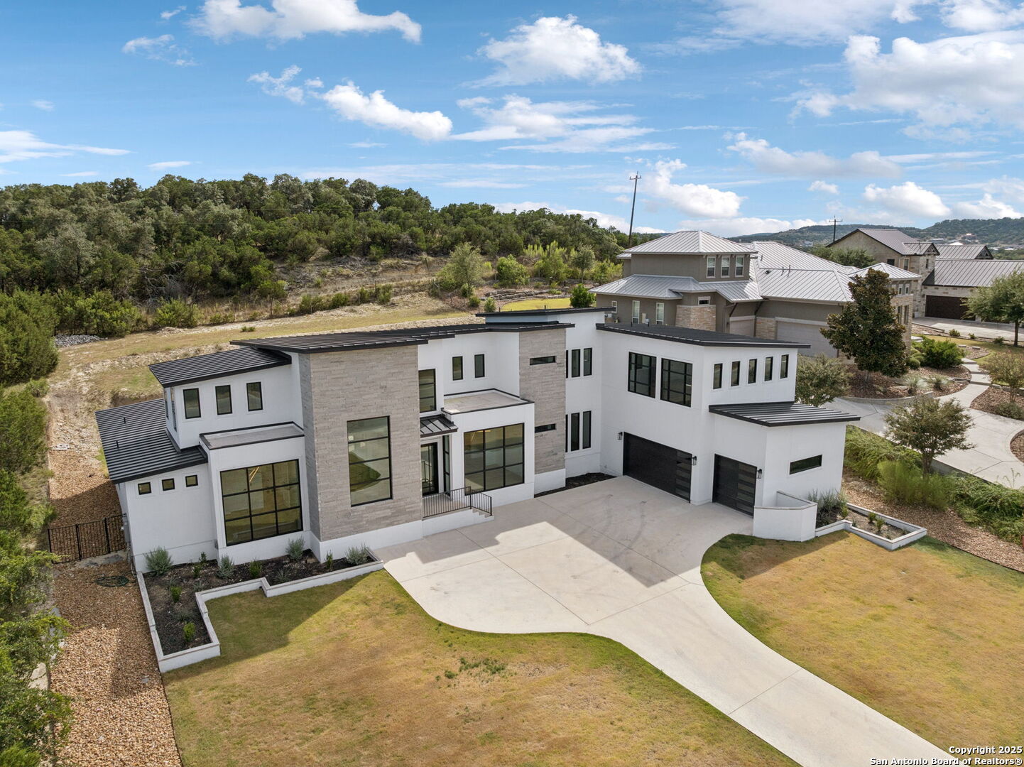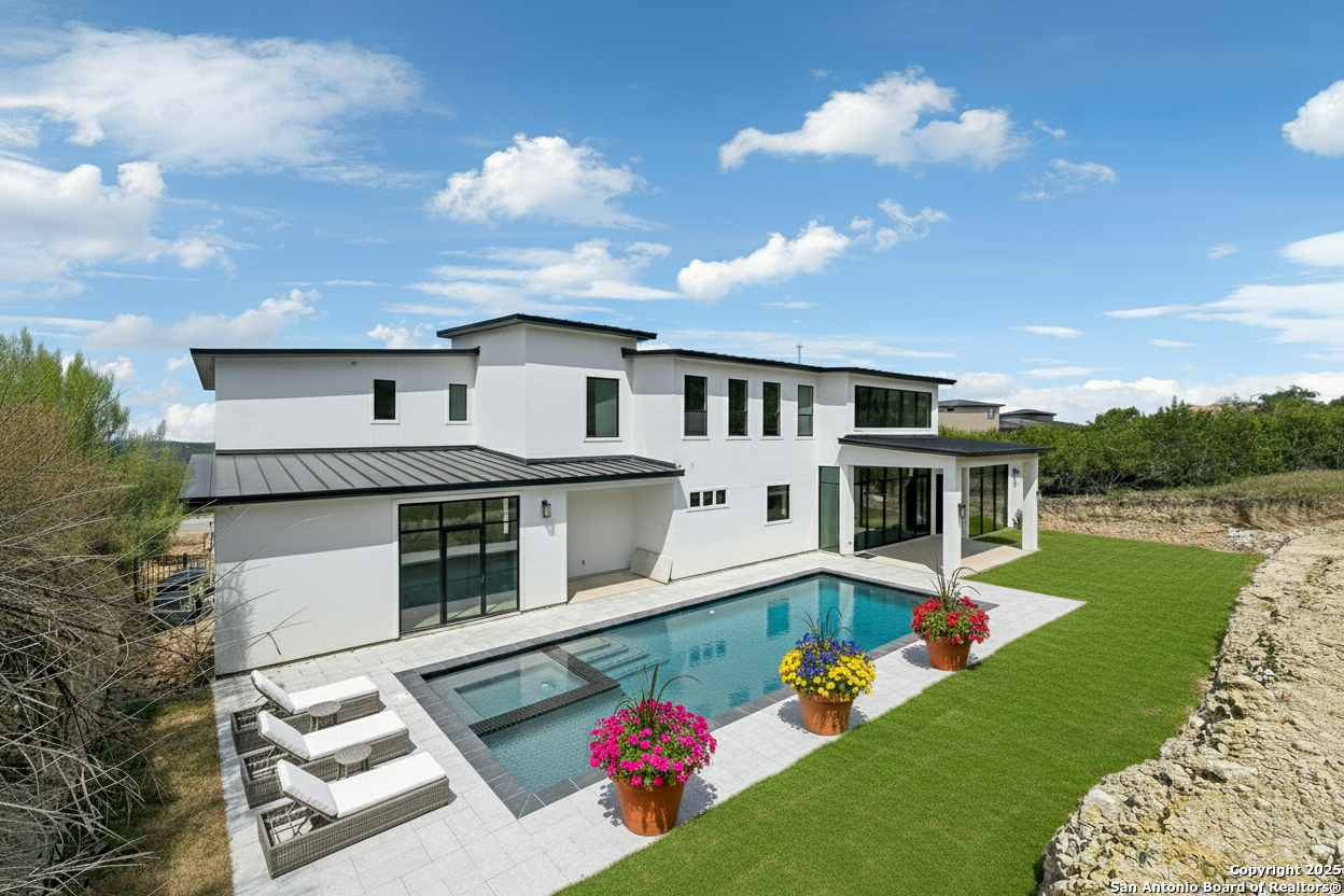 Seller motivated! Where Architectural brilliance meets the edge of the sky. There are homes you see - and homes you remember. Perched high in the prestigious Canyons at Scenic Loop, 9614 Ivory Canyon is unforgettable. It rises from the hillside like a modern sculpture, its crisp white stucco, horizontal limestone, and standing-seam metal roof glowing under the Texas sun by day and shimmering under architectural uplighting by night. From the moment you arrive, the horizon becomes yours - an uninterrupted 180 panorama of Hill Country beauty, visible from nearly every room. Step through the custom pivoting glass front door into a two-story foyer where a floating oak staircase rises beside a dramatic bookmatched marble fireplace. Natural light pours into the great room and dining space, where remote-controlled blinds, high-gloss cabinetry, and wide-plank oak floors showcase the thoughtful balance of elegance and ease. The chef's kitchen is a work of art, outfitted with a full suite of Bosch appliances - including a WiFi-enabled oven - waterfall-edge Calacatta quartz island, and a concealed walk-in pantry doubling as a prep kitchen. The primary suite is a private sanctuary designed to soothe, with floor-to-ceiling windows, boutique-style dual closets, and a spa bath wrapped in marble slabs featuring dual rainfall showers and a freestanding soaking tub. A main-level guest suite with its own living area and ensuite bath provides unmatched privacy for family or long-stay guests. Upstairs, a massive game/theater room with wet bar, storage, invites gatherings both casual and grand. Smart-home wiring throughout - including Control 4 compatibility, iPad wall controllers, and whole-home audio - ensures technology and comfort are always at your fingertips. This is a home where every detail is intentional - from remote blinds and 8-zone audio and zoned HVAC. Just six minutes from daily conveniences and 15 minutes from The Rim, yet wrapped in the quiet grandeur of the Hill Country, this home offers more than luxury - it offers presence. 9614 Ivory Canyon isn't just a home - it's a statement. Modern, bespoke, barely lived in, and built for those who demand elegance without sacrificing comfort. Schedule your private tour today and experience the harmony of design, technology, and livability this home uniquely delivers.