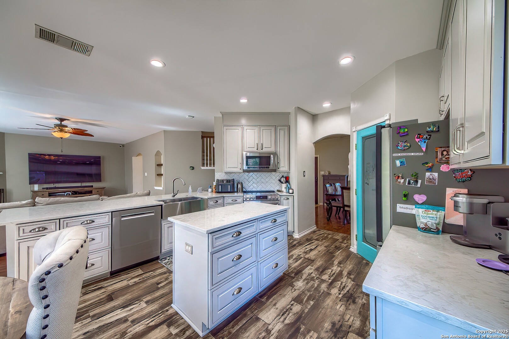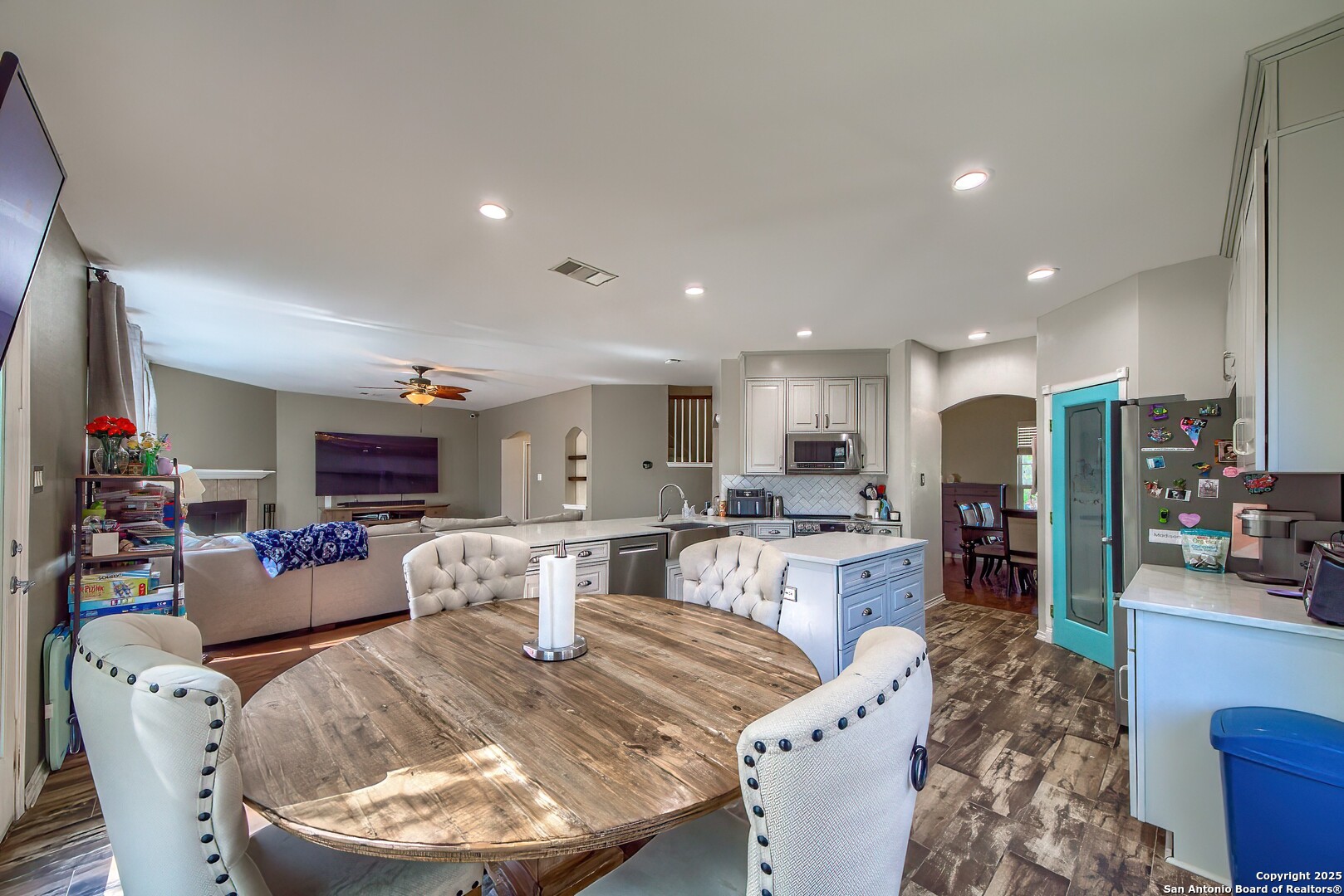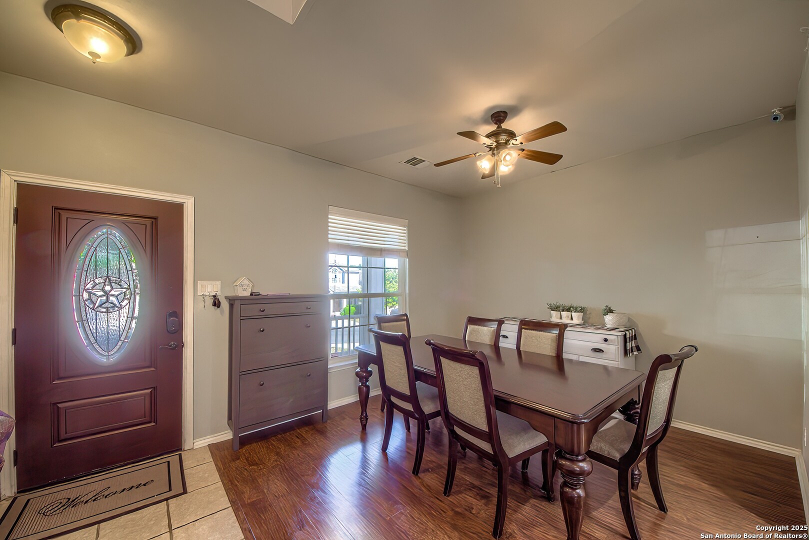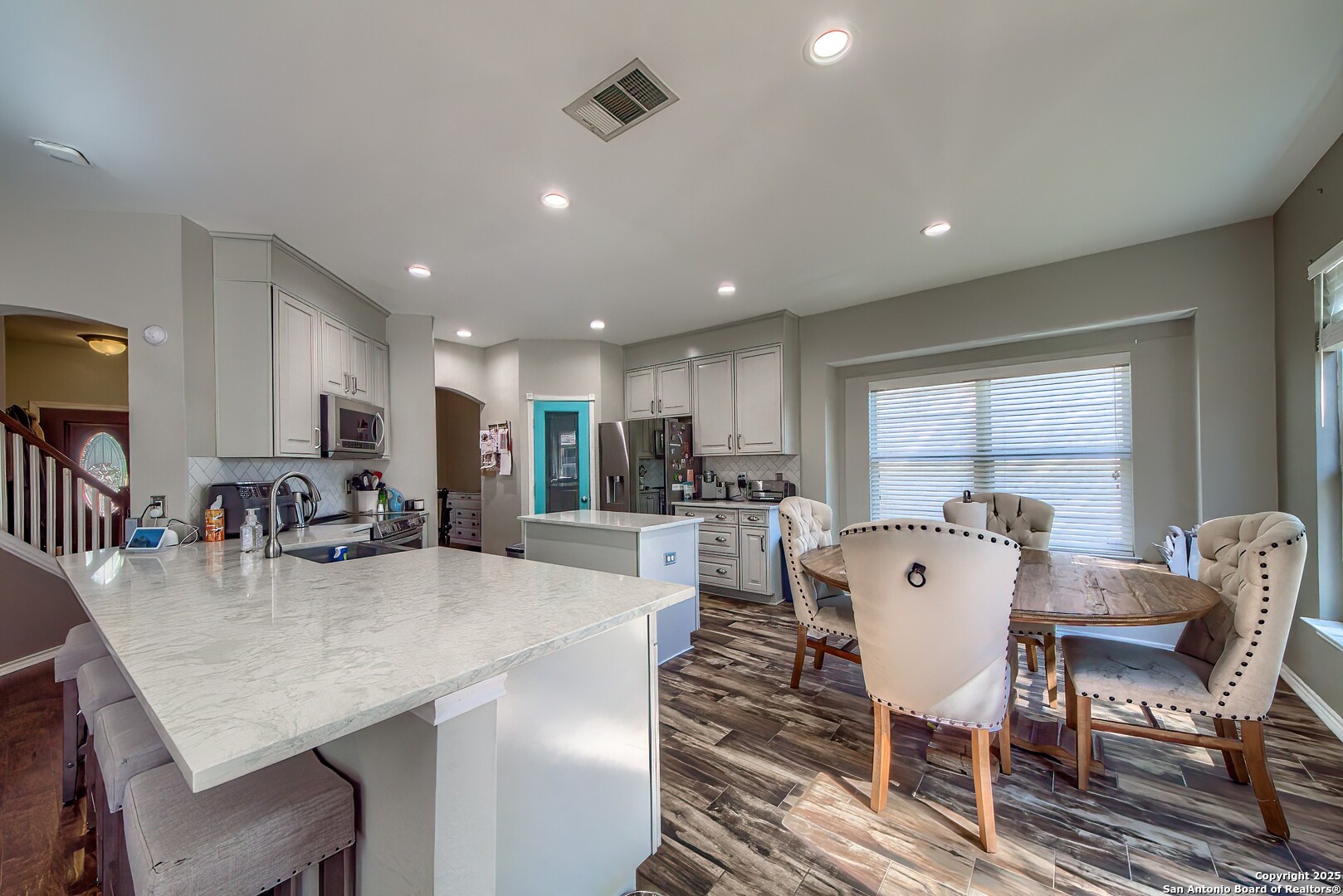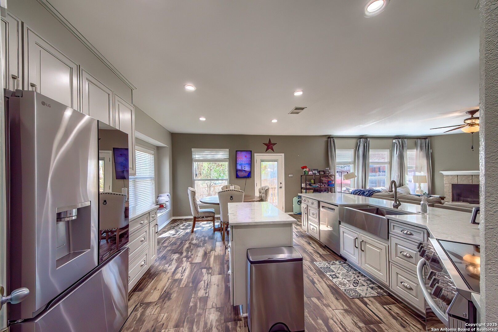 Beautifully updated and move-in ready, this 3 bedroom, 2.5 bath home with a 2-car garage offers just under 2,300 square feet of open living space in the desirable Westover Place community. Featuring high ceilings, an open floor plan, and upgraded wood and wood-look flooring throughout (no carpet anywhere), this home blends modern style with everyday comfort. The fully renovated kitchen is a standout, complete with quartz-style countertops, stainless steel appliances, a deep farmhouse sink, soft-close cabinetry, an oversized island, breakfast bar, walk-in pantry, and a charming window-seat dining nook all overlooking the spacious living room, perfect for entertaining or family gatherings. The main level also includes two dining areas and a convenient interior utility room. The oversized primary suite feels like a private retreat, offering room for a sitting or office area, and an impressive spa-inspired bathroom featuring a frameless glass walk-in shower with pebble-stone flooring, dual shower heads, double vanity, and upgraded modern lighting. Secondary bedrooms are generously sized and offer great storage and versatility. Located just minutes from Loop 1604, Hwy 151, Alamo Ranch, major retail, dining, and Lackland Air Force Base, this home delivers both style and convenience. With no updating needed, tasteful finishes throughout, and an ideal layout for hosting, working from home, or simple everyday living, this home is a rare find in Westover Place.