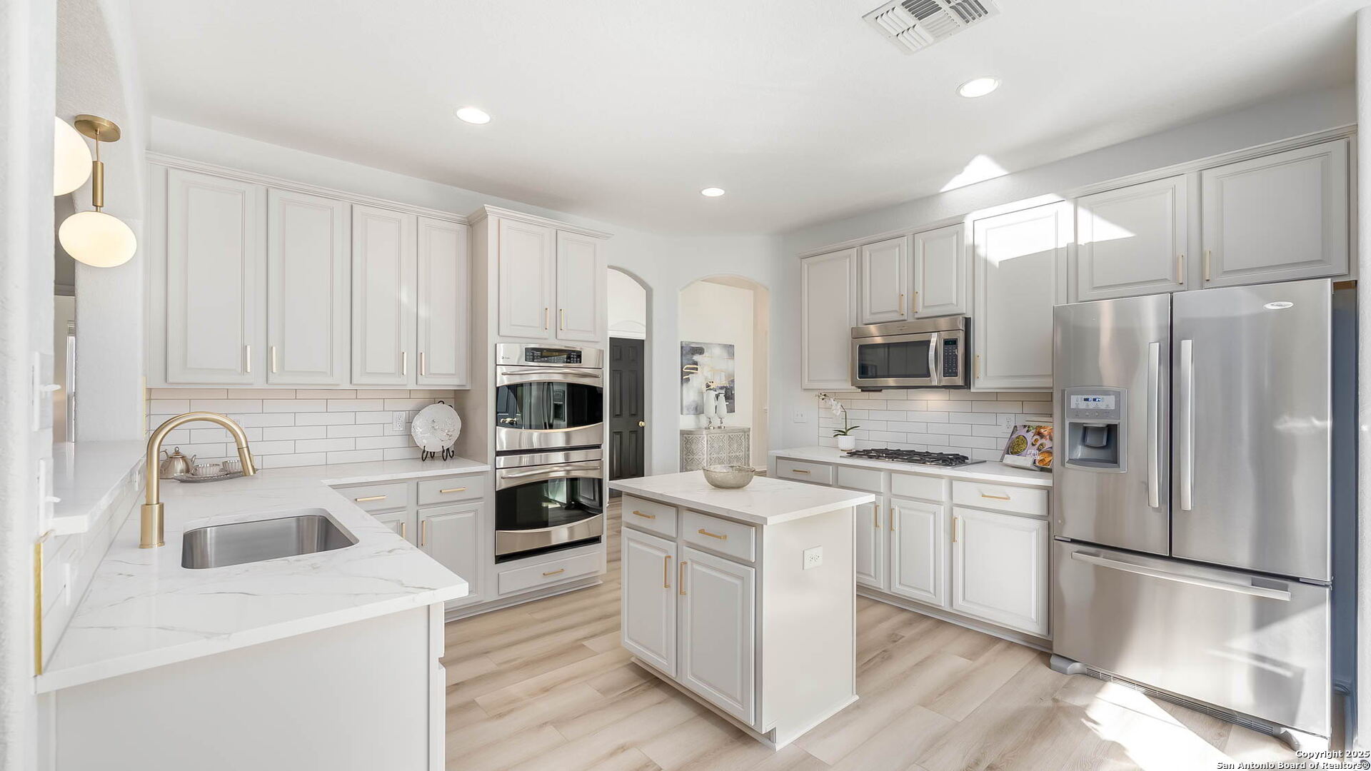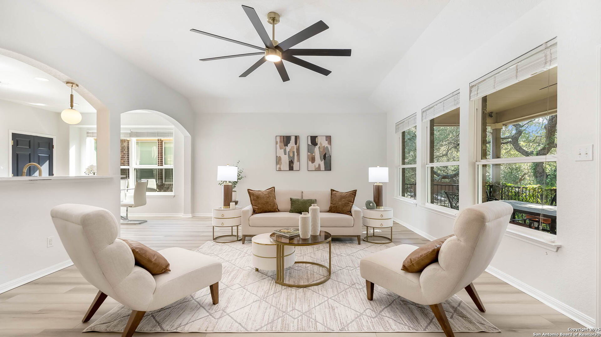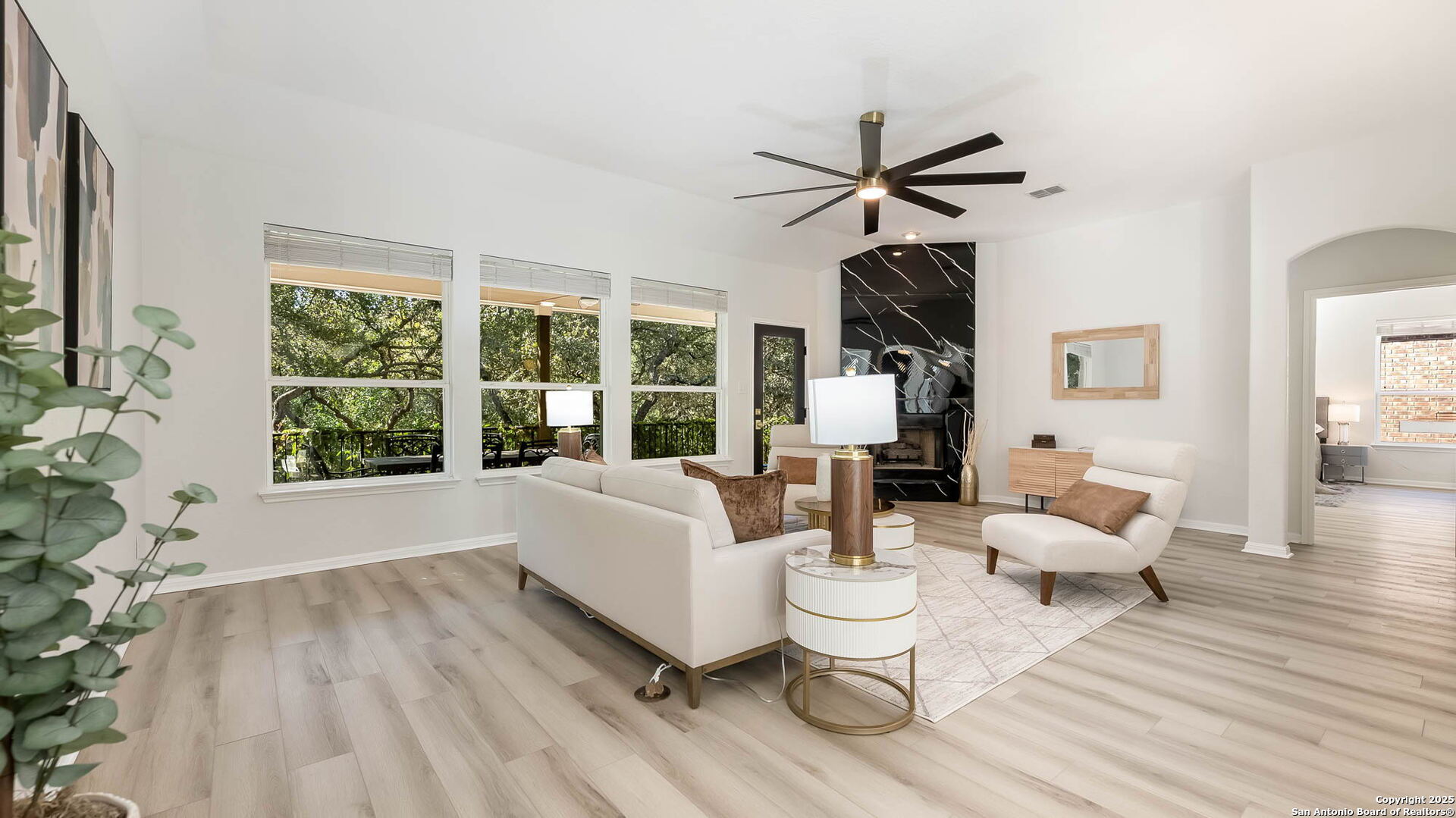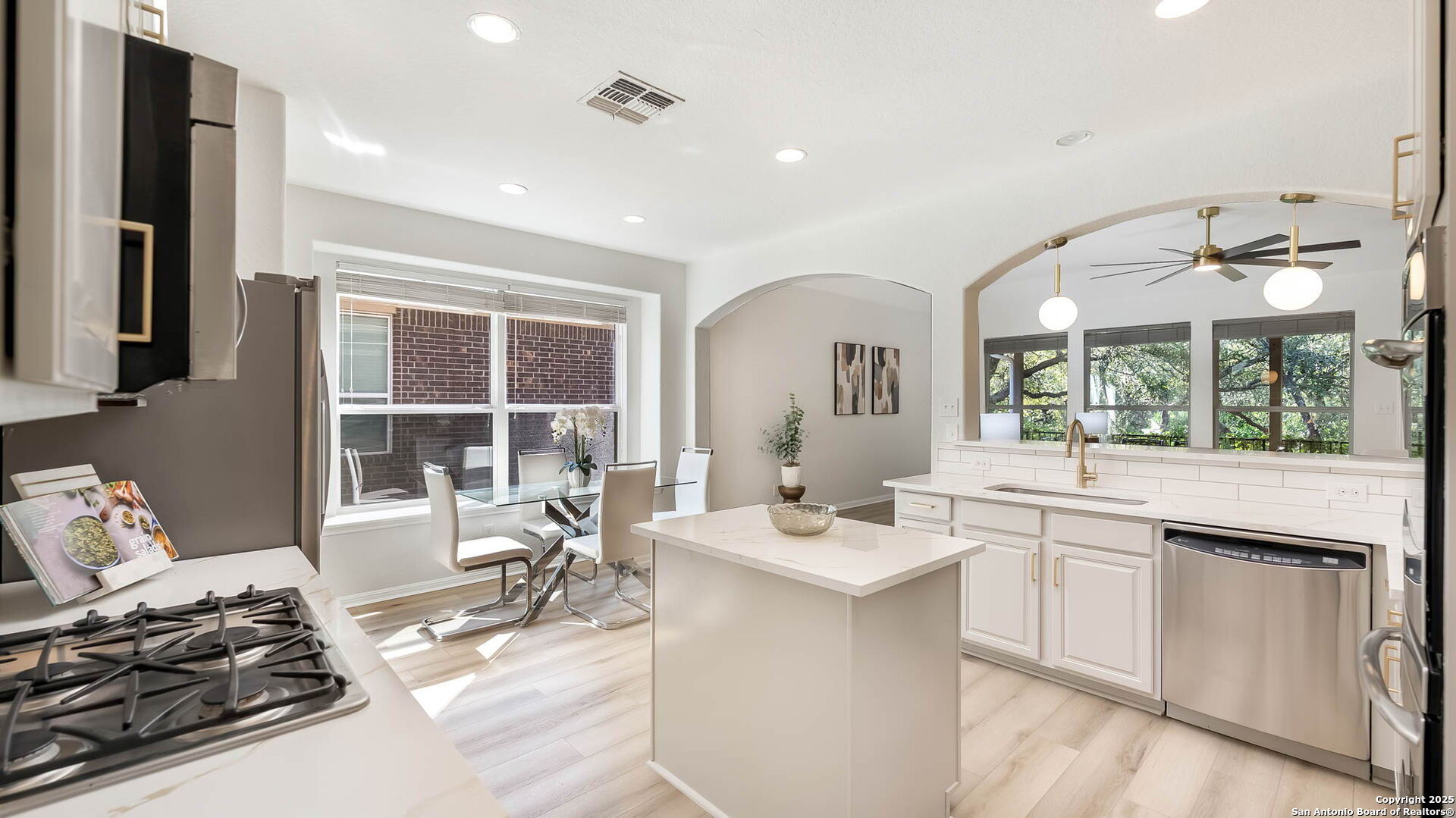 Impeccably designed and move-in ready, this elegant one-story home offers a perfect balance of sophistication and comfort within a private, gated community. Featuring an open-concept layout, this 4-bedroom, 2.5-bath residence showcases beautiful modern finishes, abundant natural light, and seamless flow between living spaces. The gourmet kitchen is the centerpiece of the home boasting sleek quartz countertops, custom cabinetry with gold hardware, stainless steel appliances, a gas cooktop, and double ovens. The kitchen opens effortlessly to the spacious living area, ideal for both entertaining and relaxing. The primary suite is a tranquil retreat with a spa-inspired bath, dual vanities, and generous closet space. Three additional bedrooms provide flexibility for guests, family, or a home office. Enjoy serene greenbelt views from the covered patio perfect for outdoor dining and peaceful evenings surrounded by mature trees. Located in a small, well-maintained gated neighborhood, this home offers privacy and convenience just minutes from Loop 1604, Highway 151, top-rated schools, major employers, and premier shopping and dining destinations.