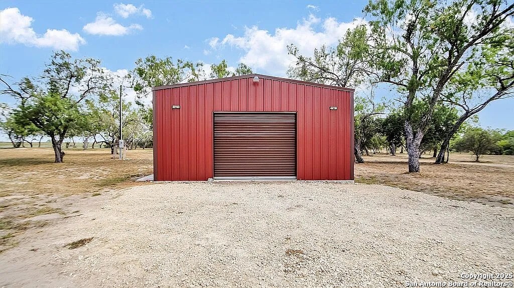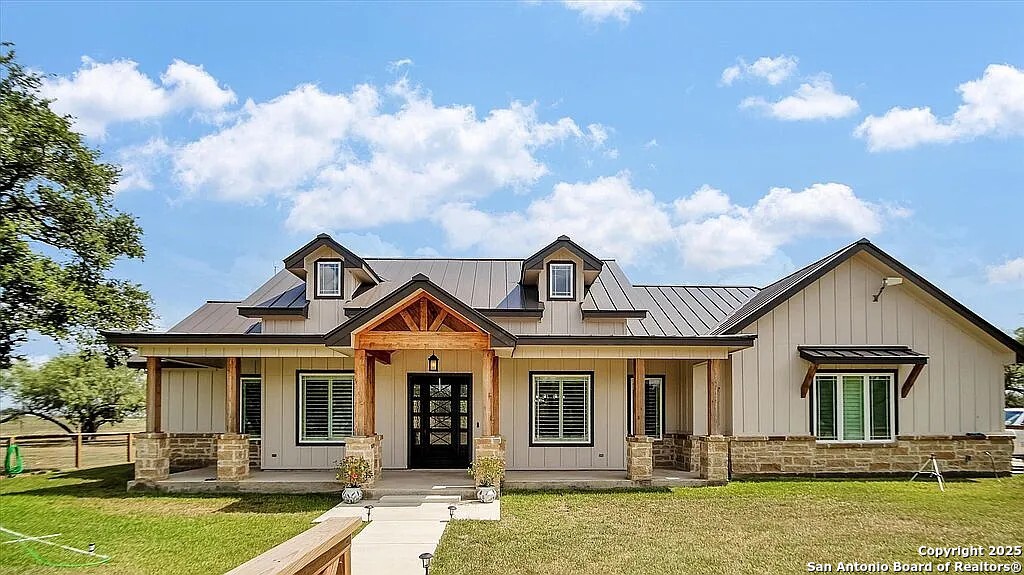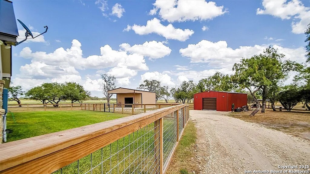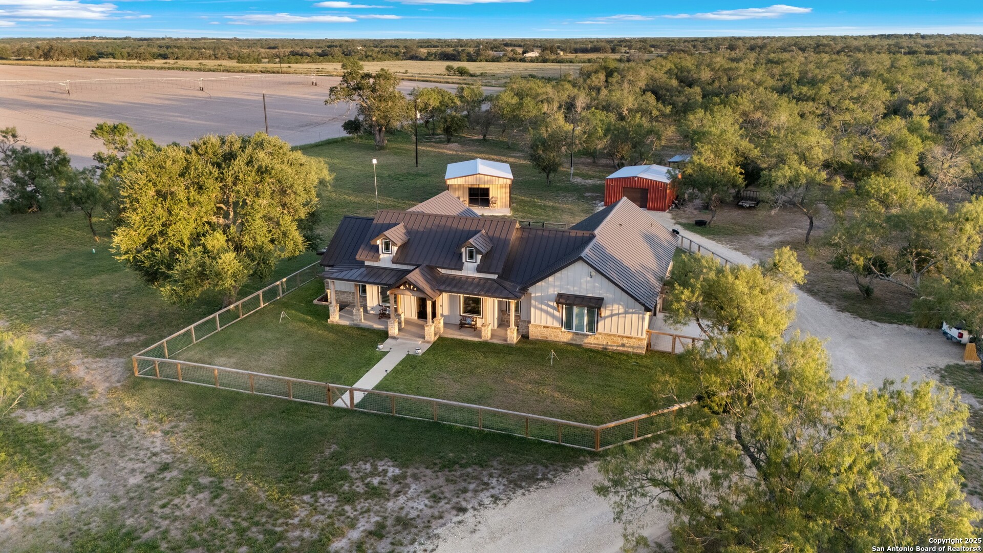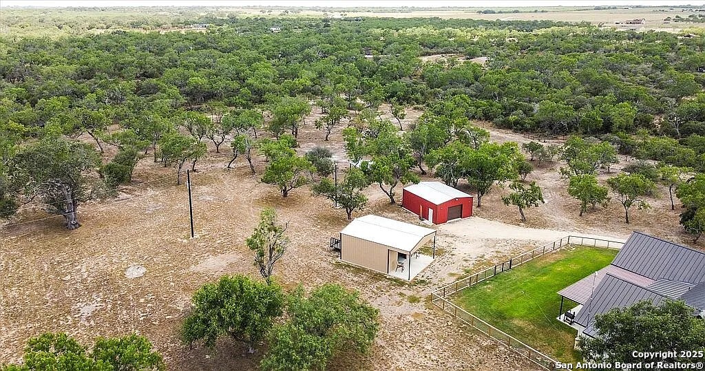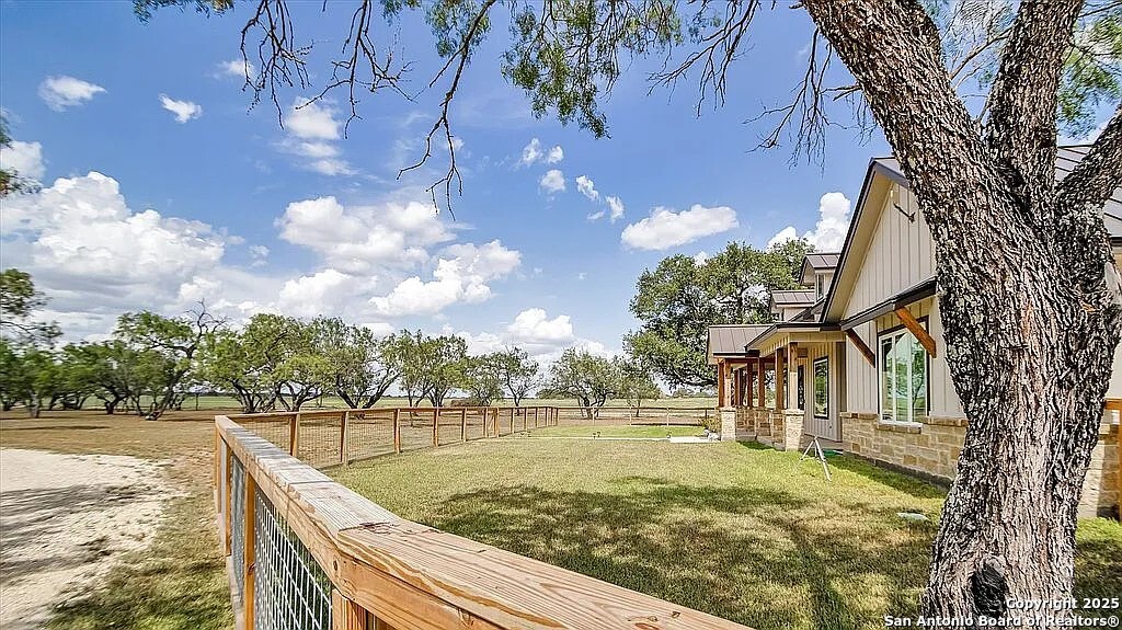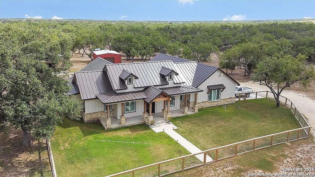 Welcome to 976 County Road 7718- a breathtaking 2023 custom-built luxury home nestled on over 11 acres of serene Texas countryside. This one-of-a-kind residence offers unmatched privacy, elegance, and charm. Boasting a secure electric gated entrance, full perimeter game fencing, sweeping panoramic views, and majestic mature oaks, this unrestricted property offers both security and natural beauty in a truly exceptional setting designed for elevated living. Step inside to soaring ceilings, an open-concept layout, and premium upgrades at every turn-including custom cabinetry, quartz countertops, elegant lighting, and a chef-inspired gourmet kitchen designed for both beauty and function. The spacious primary suite offers a spa-like retreat complete with a luxurious walk-in shower and stunning dual quartz vanities. Generously sized secondary bedrooms each offer spacious walk-in closets and abundant natural light, providing comfort and style for family or guests. Unwind on the expansive covered patio overlooking the picturesque landscape-an ideal setting for relaxing or entertaining. Enhancing the property's versatility is a fully finished detached workshop, along with a secondary metal structure-already framed and awaiting your custom vision, whether as a guest house, creative studio, or luxury recreational space. This expansive 11-acre property offers endless possibilities-perfectly suited for equestrian living, personalized enhancements, or simply enjoying the tranquility of the Texas countryside. Conveniently situated 30 minutes from San Antonio and only 5 miles from the heart of Devine, providing easy access to both city amenities and small-town charm. Schedule your private tour today!