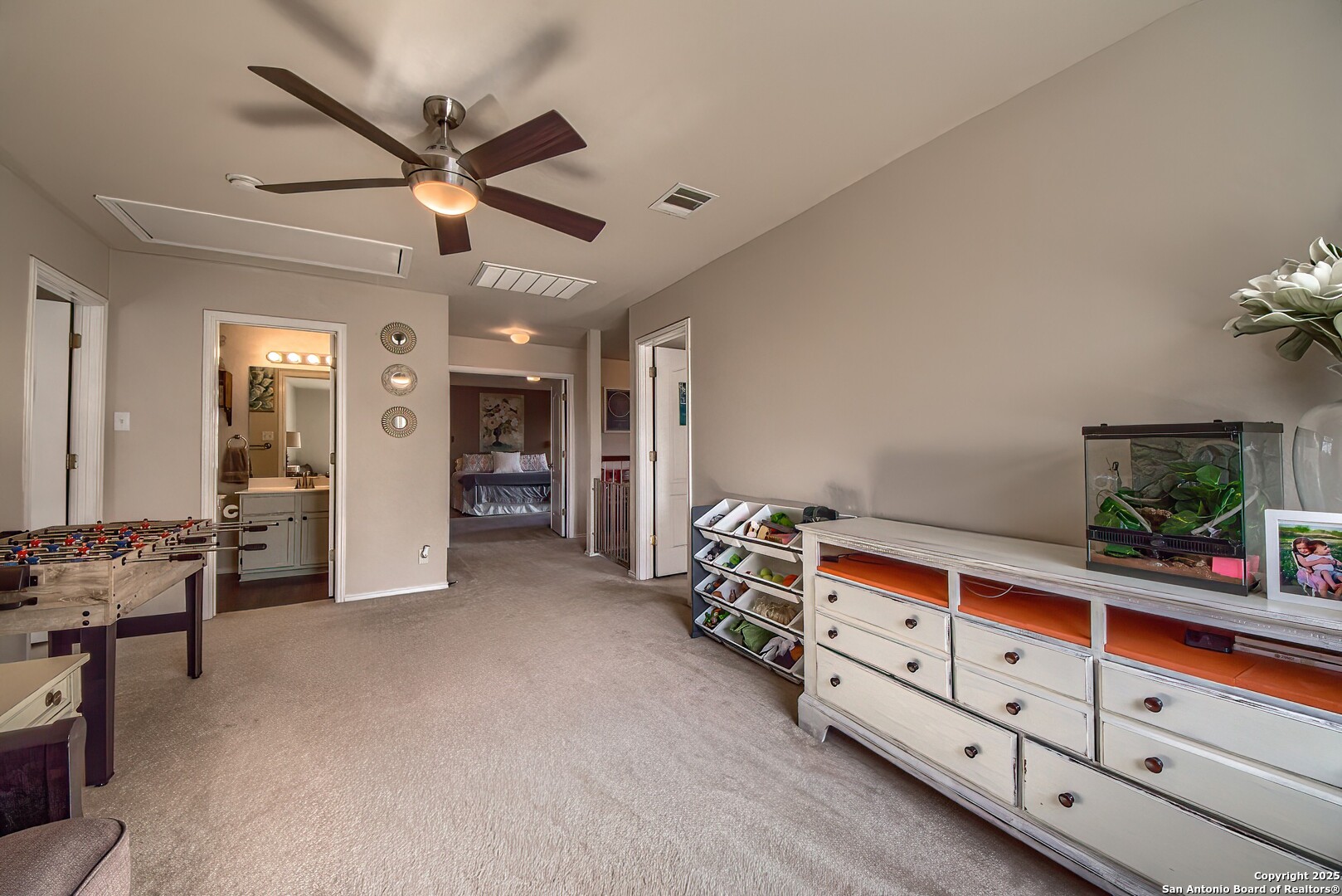 OPEN HOUSE SATURDAY, NOVEMBER 8, 3-5 PM! AFFORDABLE, MOVE-IN-READY, CUL-DE-SAC HOME IN POPULAR WILDHORSE ON AN EXTRA LARGE LOT OFFERS WAY MORE THAN YOU EXPECT AT THIS PRICE WITH THE ADDED BENEFIT OF AN EXTREMELY LOW TAX RATE! Convenience is paramount with this two-story home with both an office and two living areas. Just off 1604 at Braun, wind along the wide streets of this well-designed subdivision, one of the most sought-after in the northwest corridor. A mere two blocks from the elementary find this two-story tucked away at the end of the quiet cul-de-sac. The brick elevation and cute front porch welcome in you from the street. Once inside find a gracious foyer with long wall which opens immediately into a huge office, or flex space if you don't work from home. Then follow the luxury vinyl flooring through the foyer, and into the open concept living room. Open to kitchen and the dining nook, this room offers several different layouts for furniture. The kitchen itself is large for this price point, with newer stainless appliances, white cabinetry with modern hardware, plenty of counter space for making holiday cookies and even an island! A real treat is in store when you peek into the combined pantry and laundry room. We challenge you to find another so huge (17 feet long!) and well-designed at this price point! The washer and dryer sit at the end with a window overlooking the backyard. The rest is shelf after long shelf, making finding what you are looking for so easy. Think of the time this will save you as you cook. Access your attached two-car garage from here as well. In the living room, find what many request and is rarely found, stairs nestled at the back of the house. At the top you are greeted with a loft, ideal as a second living area or gameroom with an extra nook off to one side perfect for setting up a work station for school work. The primary bedroom sits off on one side -- spacious in its own right with room for another office, exercise space or sitting area. The ensuite bath offers two vanities, bath/shower combo and a giant closet with a unique design, allowing for smart use to maximize space. A convenient guest bath serves the other large two bedroooms, each door set off a different wall for privacy and each with deep closets. This is a floor plan that does not rob space from one room to give to another -- feel like each room is just the right size. Out back, enjoy the covered patio and the additional, uncovered patio slab the sellers added for more seating, firepit and more. The fully privacy fenced, level yard is extra large for this neighborhood with plenty of lawn on either side and the back -- garden, set up play scapes or even add a swimming pool. But, you would not need to do that, of course, because the amenities in Wildhorse are top notch -- with a Olympic sized swimming pool, pavilion, dog park, playgrounds, sports parks for soccer & basketball and even a space to fly kites. Have peace of mind that many of the mechanics are younger -- a 2025 water heater and HVAC systems replaced in 2022-2023. Another plus for your budget is the incredibly low property tax rate in this neighborhood at 1.85!! That's a huge savings in your monthly payments. All this in highly rated Northside ISD, zoned for Sotomayor High, built in 2022 on 75 acres. Being on the edge of Helotes, just a mile off of 1604 and close to Highway 151 with all the restaurants and shopping, means quicker commutes just about everywhere including downtown, SeaWorld, Lackland AFB. La Cantera is just a few exits east. This area is eligible for zero down USDA financing!! Don't wait to add this absolute gem to your list and your showings will stop here!