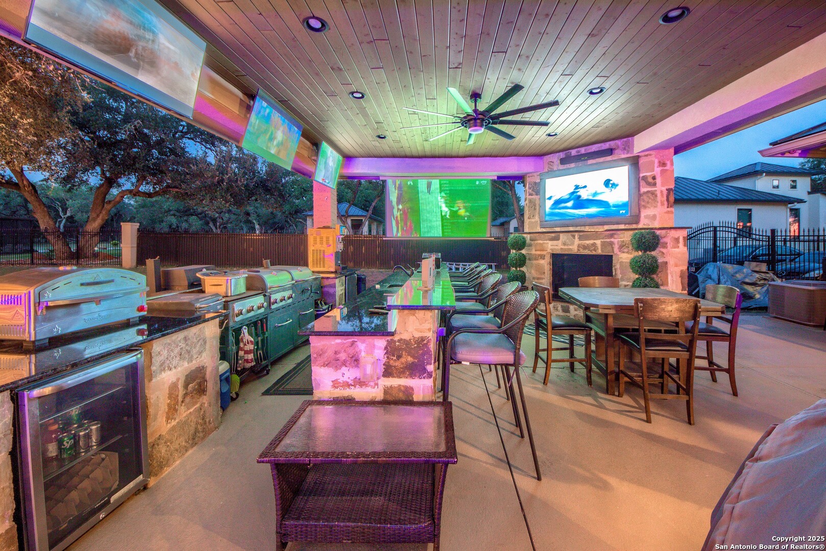 Discover timeless elegance in this remarkable Hill Country estate! Situated on expansive acreage in the prestigious gated community of New Braunfels' Rockwall Ranch, this grand mansion is a testament to refined taste, offering 10,031 square feet of opulent space under roof across three levels. Designed for both beauty and function, this estate features six sumptuous bedrooms -- five of which are ensuites -- and six and a half luxurious baths. Every corner exudes sophistication and comfort, from the three-car garage to the resort-style pool and fully outfitted outdoor bar/kitchen. Approach via a scenic drive through oak-draped limestone hills, where the charm of the community is highlighted by deer grazing in the front yards of neighboring estates. The residence's magnificent curb appeal is matched by an entryway featuring gleaming travertine floors and soaring ceilings, and a breathtaking view of the lagoon pool's impressive waterfall. Life here offers things not even imagined including a secret passage from study to master bath where copper tub and cascading waterfall from the ceiling create an unforgettable experience. The massive gourmet kitchen, equipped with Brazilian Black Fusion granite, custom hickory cabinetry, sub zero style refrigerator and professional-grade gas appliances, is a chef's dream. Retreat back to the master suite, where cozy meets class. The spa-like master bath boasts his-and-hers vanities, electric fireplace over the tub, gracious walk-through shower and an expansive walk-in closet. A second downstairs primary suite sits on the opposite wing of the home, ideal for privacy for guests or for those who are looking for multi-generational living downstairs. A huge laundry room is tucked away downstairs with extra room for ironing board and folding space. Upstairs find an entertaining loft, long covered balcony overlooking the back acreage and three more extremely spacious ensuites, one of which with water cascading from the ceiling into another copper tub! Enjoy the dedicated meditation or prayer room which could double as a second office as well. Entertain in the spacious game room with bar and multiple game tables or watch a movie in the media room with theater seating, all of which will convey. Outdoors, unwind by the heated, self-cleaning Anthony & Sylvan pool with fountaining water in addition to the magnificent waterfall or entertain in the outdoor kitchen with full bar seating, fireplace, grills, commercial margarita machine, pizza oven and TVs mounted at every angle so you won't miss one play of the game. The attached, side entry two car garage is more than a place just to store vehicles. Here, find storage space and a second washer and dryer for those who want to wash those hobby clothes. The third floor is a huge finished expanse ideal for a teenager hangout, office or simply if you need hundreds of square feet of climate controlled storage! With advanced technologies like surround sound and energy-efficient features, this home is both a sanctuary and a masterpiece. If this isn't enough resort living at home for you, you don't have to go far to find more! Rockwall Ranch itself offers a community pool, clubhouse and fishing lake which is why so many residents travel the neighborhood in their golf carts, making it easy to get to know your neighbors! It is often difficult to find a home where extraordinary luxury meets embracing comfort but this property is one of the rare ones. Just 20 minutes from I-35, shopping, restaurants and downtown San Antonio, while being only 15 minutes from the river, Gruene and New Braunfels & 20 miles from summer fun at Canyon Lake, this perfect location offers an unrivaled convenience and being outside city limits means lower property taxes as well. Visit and make this breathtaking estate your own.