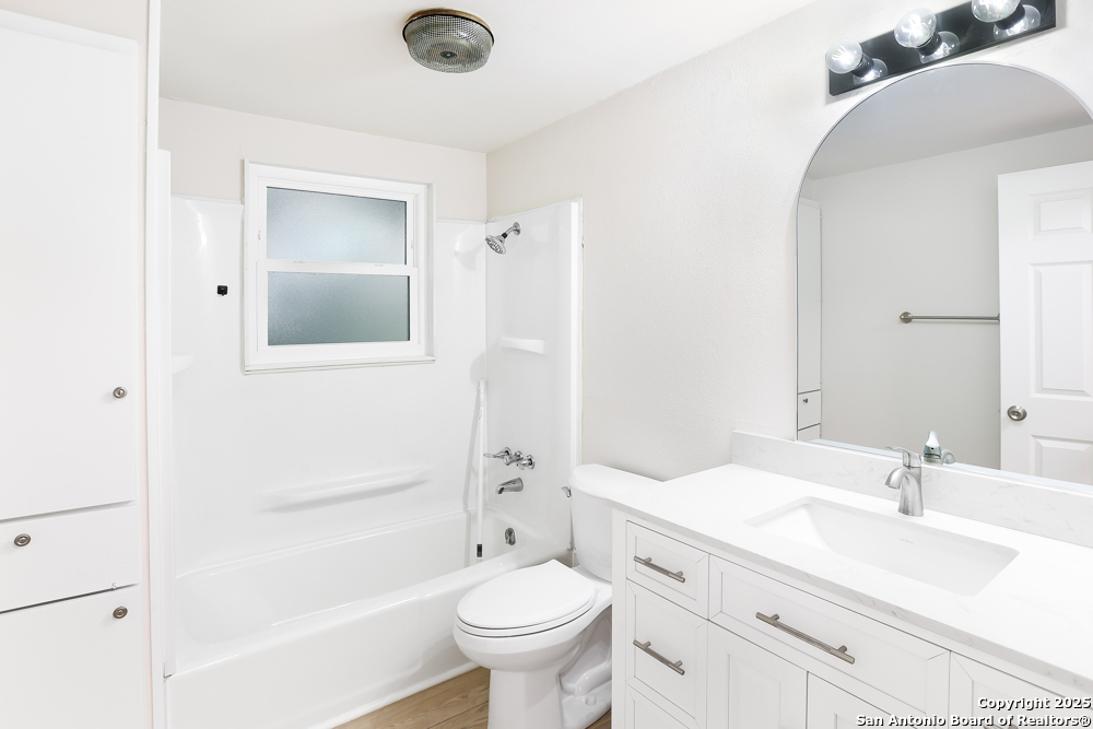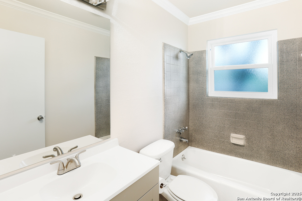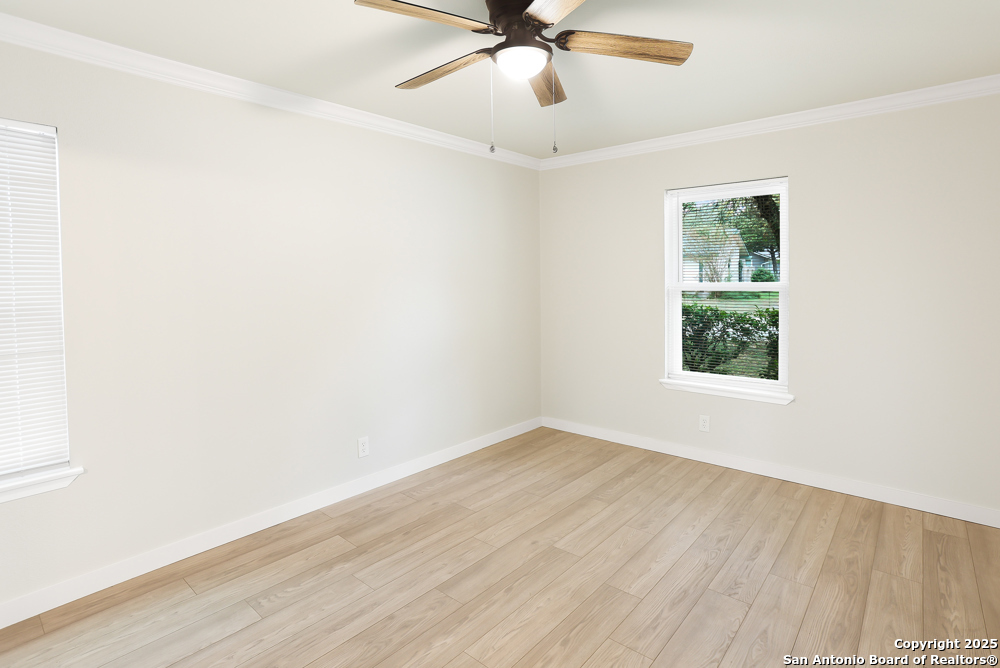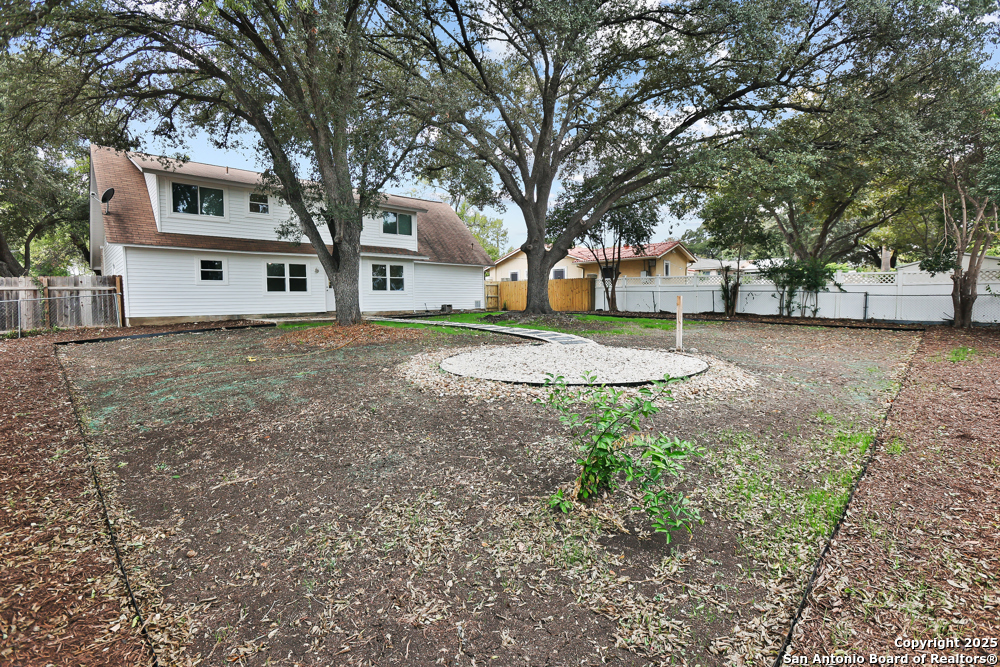 Located in the well-established North Star Hills subdivision, this spacious two-story home offers an open floor plan with newly installed flooring on the first level, fresh interior paint and new siding. A formal dining room sits just off the entry with easy access to both the family room and kitchen. The family room features built-in shelving, high ceilings, a ceiling fan, and abundant natural light. The kitchen includes newly installed, stainless steel appliances-refrigerator included-and plenty of cabinet space for storage. The primary suite is located on the first floor and offers high ceilings, a ceiling fan, a single vanity, and a tub/shower combo. All secondary bedrooms are upstairs, offering privacy and flexibility for family or guests. The oversized backyard is shaded by mature trees and features a privacy fence and stone walkway ideal for a BBQ pit or chiminea. Conveniently located near major highways, the San Antonio Airport, Incarnate Word, The Pearl, shopping, and dining.