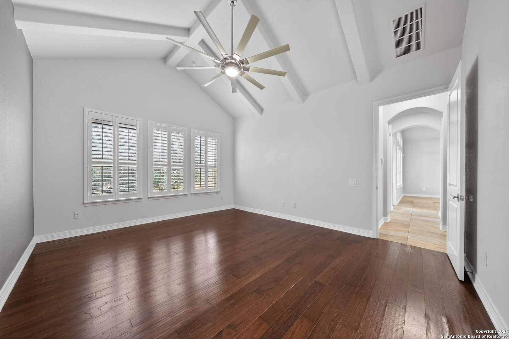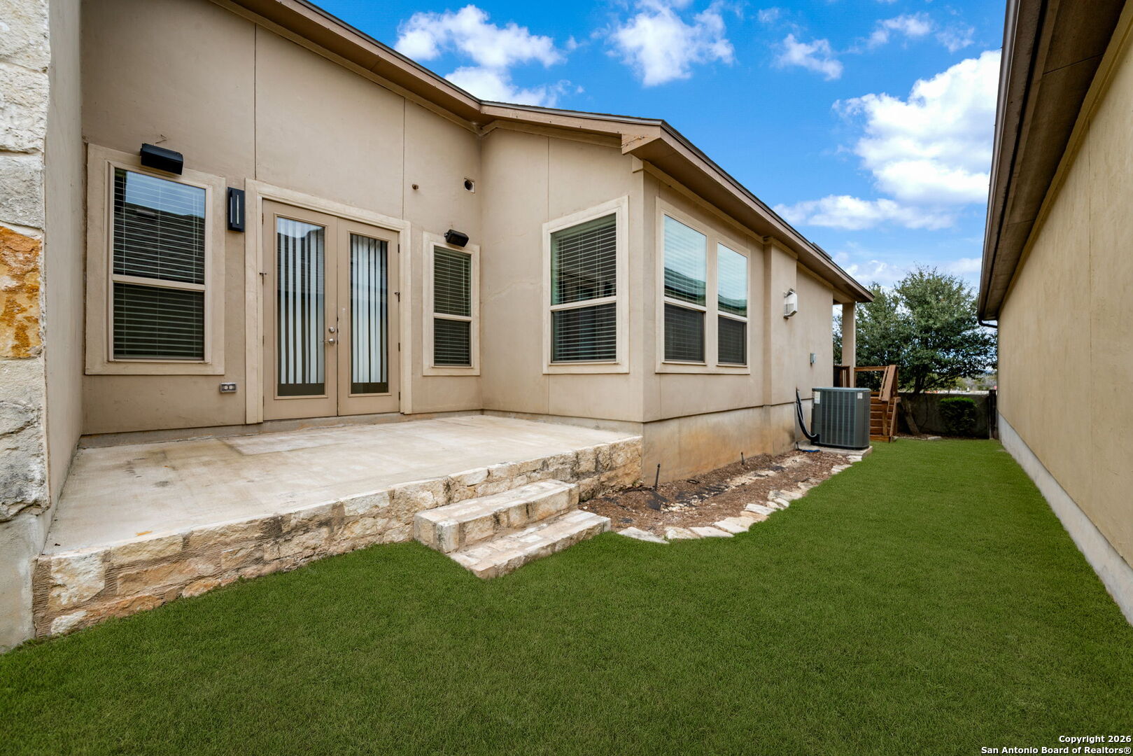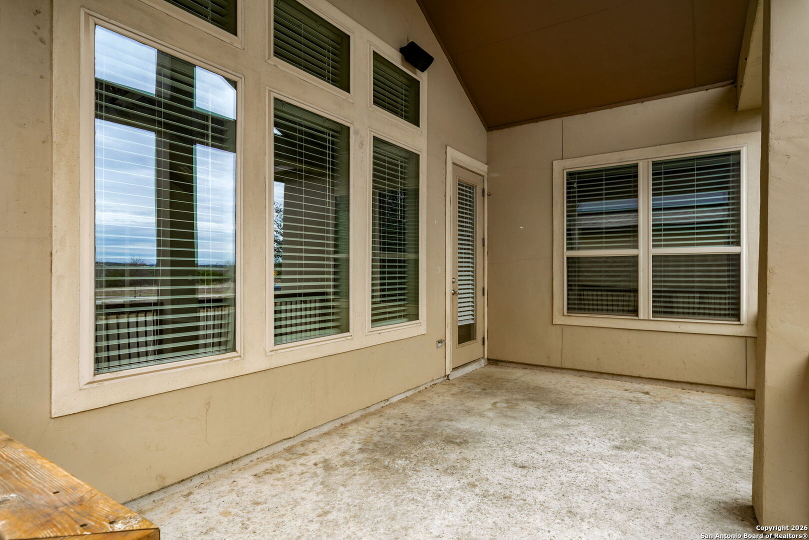 Welcome to refined Hill Country living at 9911 Barefoot, an elegant single story Sitterle Home quietly positioned within the Gardens section of the gated Balcones Creek community in Boerne. Thoughtfully designed and impeccably maintained, this home blends timeless craftsmanship with modern comfort, all set against sweeping Hill Country views. The highly sought after Madrid floorplan offers three private bedroom suites, each with its own en suite bath, along with a dedicated office, three and a half baths, and a three car tandem garage. Two covered outdoor patios invite effortless indoor outdoor living, ideal for both entertaining and everyday enjoyment. From the moment you enter, the home makes a graceful impression with a chandelier accented foyer and immediate views of the surrounding landscape. You'll love the hard flooring throughout with no carpet! Expansive cathedral ceilings and oversized windows flood the living and dining spaces with natural light, creating an open yet inviting atmosphere. The kitchen is both beautiful and functional, designed as the true heart of the home. A generous island anchors the space alongside double ovens, a gas cooktop, walk in pantry, abundant cabinetry, and smart appliances that elevate both form and function. The primary suite is a serene retreat, featuring cathedral ceilings and plantation shutters. The spa inspired primary bath offers a soaking tub, an oversized shower with seating bench, a skylight that fills the space with soft natural light, dual vanities, and a spacious walk in closet. Step outside to the covered back patio and take in Hill Country sunsets and app connected speaker system for effortless relaxation. Additional exterior features include rock landscaping, smart irrigation system, and the convenience of a 75" Sony TV above the fireplace as well as the Samsung washer and dryer with pedestals. New roof installed in 2023! The Gardens in Balcones Creek features an HOA maintained front and back lawn care, along with security monitoring. Balcones Creek residents enjoy access to a junior Olympic sized pool, child pool and splash pad, playground, amenity center, and community garden. Located within Boerne ISD, with no city taxes, the home offers quick access to I 10, just minutes from downtown Boerne, La Cantera, and The Rim. The upcoming Lemon Creek Ranch development, featuring H E B, shopping, and dining, adds even more convenience to this exceptional location. This is Hill Country living at its finest, where comfort, privacy, and understated luxury come together seamlessly.