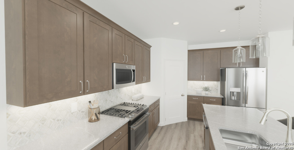 This charming two-story home is designed for modern living and effortless entertaining. The gourmet kitchen features quartz countertops, upgraded cabinetry, and a walk-in pantry, seamlessly flowing into the bright, spacious family room with large windows overlooking the backyard. The secluded primary suite provides a serene retreat with double vanities, an oversized shower, and a generous walk-in closet. Upstairs, a versatile loft is surrounded by three secondary bedrooms, each with its own walk-in closet, offering plenty of space for family or guests. Step outside to the covered patio and enjoy a beautifully landscaped yard complete with a full sprinkler system, perfect for outdoor gatherings or relaxing in the fresh air. This home is part of our Roosevelt Collection-bringing old-world style into today's modern living. Deep finishes, bold accessories, and rich textiles create a backdrop that's perfect for both lively dinner parties and cozy, well-deserved naps afterward. Roosevelt is where character and comfort collide, making your home the place where memories are made and savored. This home is located in Saddlebrook Ranch, a master-planned community in the charming city of Schertz-named one of CNN/Money's top small towns. Enjoy easy access to I-35, premier shopping, dining, and Randolph Air Force Base. Planned amenities include a sparkling pool and playground, perfect for family fun. With the highly regarded Schertz-Cibolo-Universal City School District nearby, Saddlebrook Ranch offers the ideal blend of community, convenience, and small-town charm.