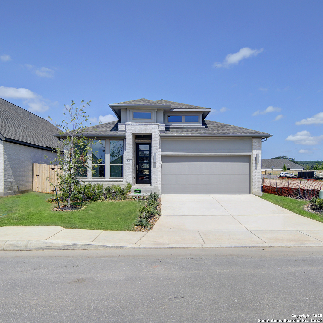 Extended entry with 12-foot ceiling leads to open kitchen, dining area and family room with 10-foot ceilings throughout. Kitchen features center island with built-in seating. Family room features wall of windows. Primary suite with 10-foot ceiling and wall of windows. Dual vanities, garden tub, separate glass-enclosed shower and large walk-in closet in primary bath. A guest suite with private bath adds to this four-bedroom home. Covered backyard patio. Mud room off two-car garage.