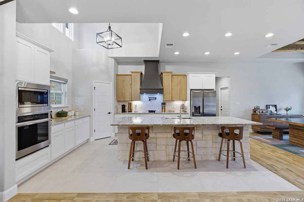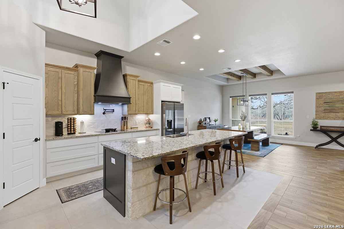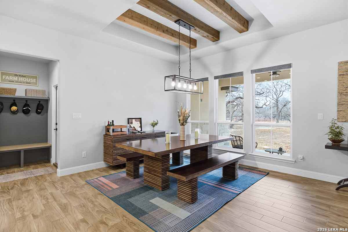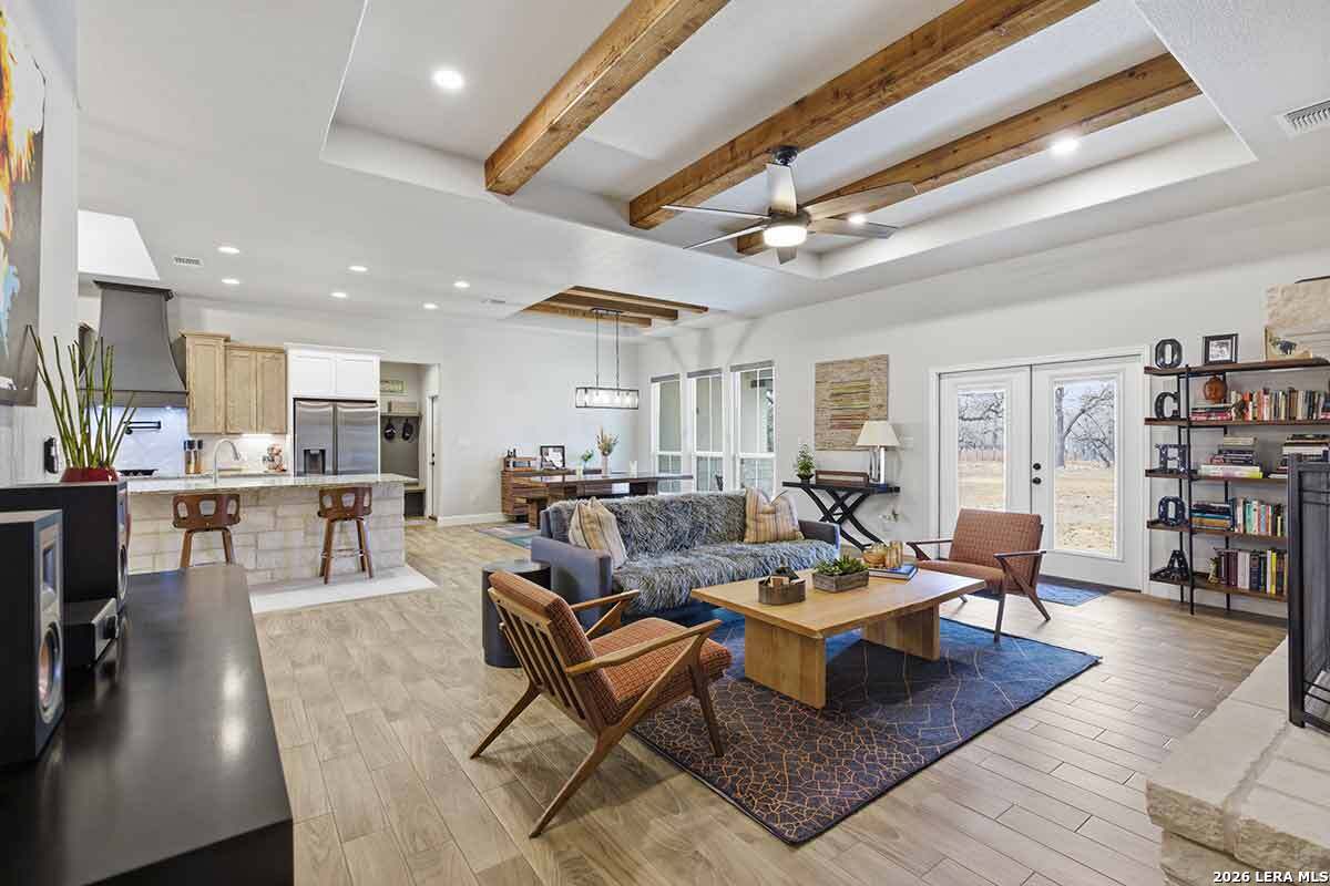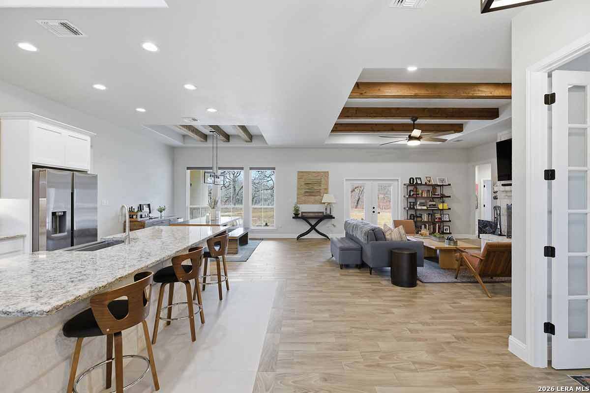 Completely Charming + Abundant Upgrades and Priced To Sell! This Home Has It All: Built in 2022, situated on 1 acre of wooded countryside with a fully-fenced back yard. The layout affords an Expansive Open Living/Dining/Kitchen space, 4 Bedrooms + Study + 3 Full Baths. Farmhouse Flair & So Many Custom Touches! The Kitchen features a Generous Island, Stainless Steel Farm-Style Sink, Samsung Appliances, Chic Tile Backsplash, Pot Filler at Cooktop, with Tasteful 3-tone Cabinetry including Floating Shelves! Exposed wood beams grace the ceilings in the Dining + Living Room, which also features a dramatic Stone Fireplace as the centerpiece of this gathering space. At the front of the home is the dedicated study/office - and with Fiber Optic Internet, remote work is a breeze! Journey into the 4th Bedroom/Guest Suite, with double doors to the patio, abundant windows for natural light, vaulted ceiling w/wood beam, and nearby full bath - overlooking the back yard, it's also a perfect 2nd living area, game room, or 2nd office! The two secondary bedrooms are separated down a hallway, and the hall bath features dual sinks and a spacious Granite counter. Best for last, the Master Suite is a "dream come true" with stylish free-standing tub and separate walk-in dual-head shower ... plus dual sinks/vanities, and dual closets! Don't miss the mud bench as you come in from the garage, plus the fun laundry room with deco-tile floor, cheery cabinets, and sink ... making chores a delight! Broad Back Patio overlooking the fully-fenced back yard and wooded countryside ... this property backs to larger acreage, and there are no immediate neighbors to the back or one side, offering privacy and an even-more-country feel! Fashionable window shades throughout. Oversized extra-deep garage w/epoxy floor. All of this just 35 minutes from the heart of San Antonio, and convenient to the amenities of La Vernia and Floresville. The esteemed Eden Crossing community offers a wonderful community park with pond & paved walking trails. Exceptional!