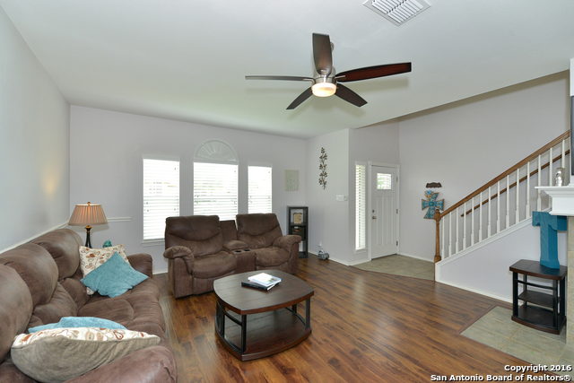This better than new, immaculate five bedroom, 2 ½ bath, two car garage home is located on a corner lot with a greenbelt. It offers a fireplace in the living room, an oversized game room, and durable wood style laminate flooring. Additionally, the chef’s kitchen presents large cabinets, custom tile & glass block backsplash, a lazy-susan corner cabinet, custom pulls, stainless steel appliances, and upgraded lighting.